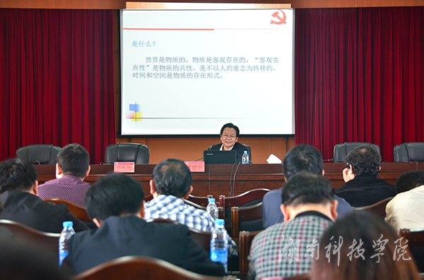 本网讯(实习记者 李瑞雪 摄影 刘信)4月16日上午,湖南省委党校副校长、湖南行政学院副院长曹健华教授为处干班学员作题为“马克思主义哲学与党性修养”的讲座。