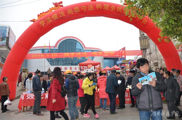 本网讯(记者 龙夏萍 涂楚琪)如何让普通百姓学法、知法、懂法并主动使用法律来维护自身的消费权益? 3月15日,由我校人文与社会科学学院法律服务中心牵头, 零陵区司法局、零陵区农业局、零陵区药监局及零陵区潇湘门社区联合举办的“携手共治,畅享消费—3.15消费者权益保护大型公益普法活动”在零陵商业城举行。