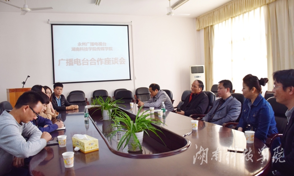 永州市广播电台主任记者、资深媒体人管顺生,电台主播宋燕、节目策划宋建云,传媒学院院长杨增和,校党委宣传部、统战部副部长、新闻中心主任唐励及传媒学院、“校园之声”广播站部分师生参加洽谈。