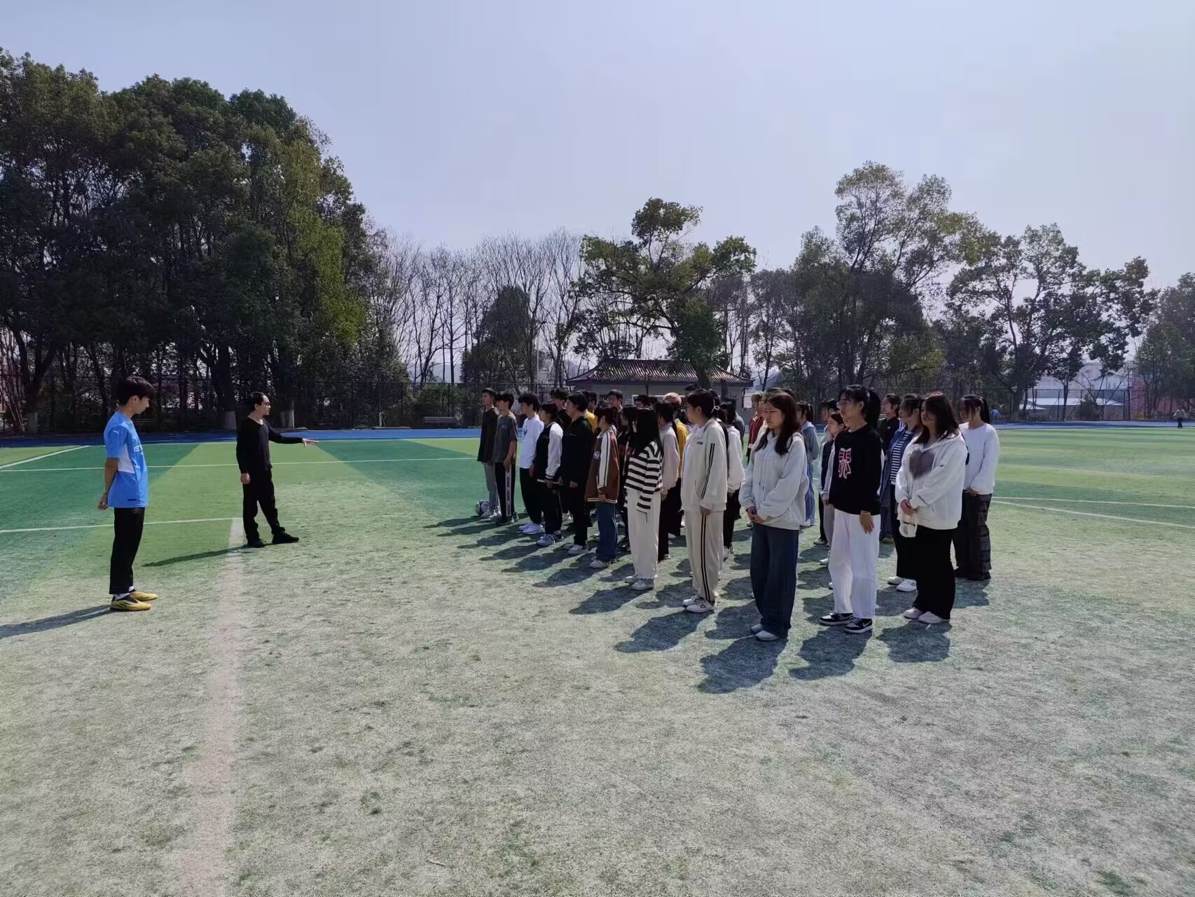 足球场上,生教2201班全体同学排列整齐有序,充满青春朝气。覃佐东强调:“一年之计在于春,一日之计在于晨。春天是播种希望、接续奋斗的美好季节。要珍惜清新的空气、干净的水和灿烂的阳光,平日里同学们应走出教室、走进田径场,多运动、多锻炼、多晒太阳,呼吸新鲜空气,做一个身心健康的新时代青年。”运动过程中,师生们团结协作、尽情奔跑,挥洒汗水。传球、射门,精彩不断。在这场美不胜收的大好春光里收获快乐、释放青春活力。