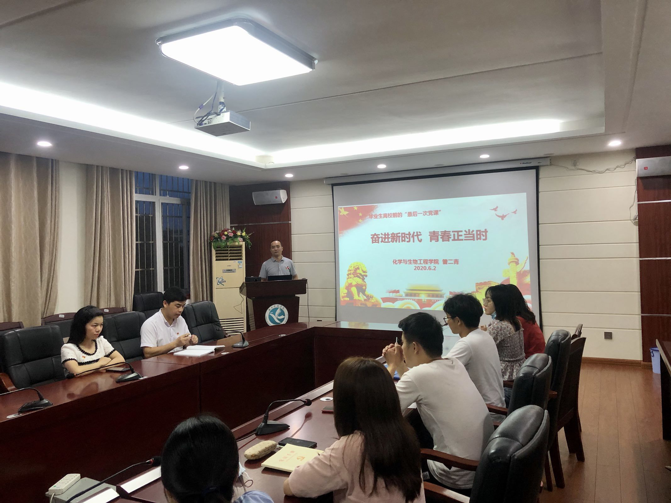 (本网讯 李燕)6月2日晚,在2020届毕业生党员即将告别校园之际,学院党总支书记曾二青在逸夫楼320会议室为2020届毕业生党员上了一堂主题为“奋进新时代 青春正当时”的党课,学生党支部书记和毕业生党员参加。