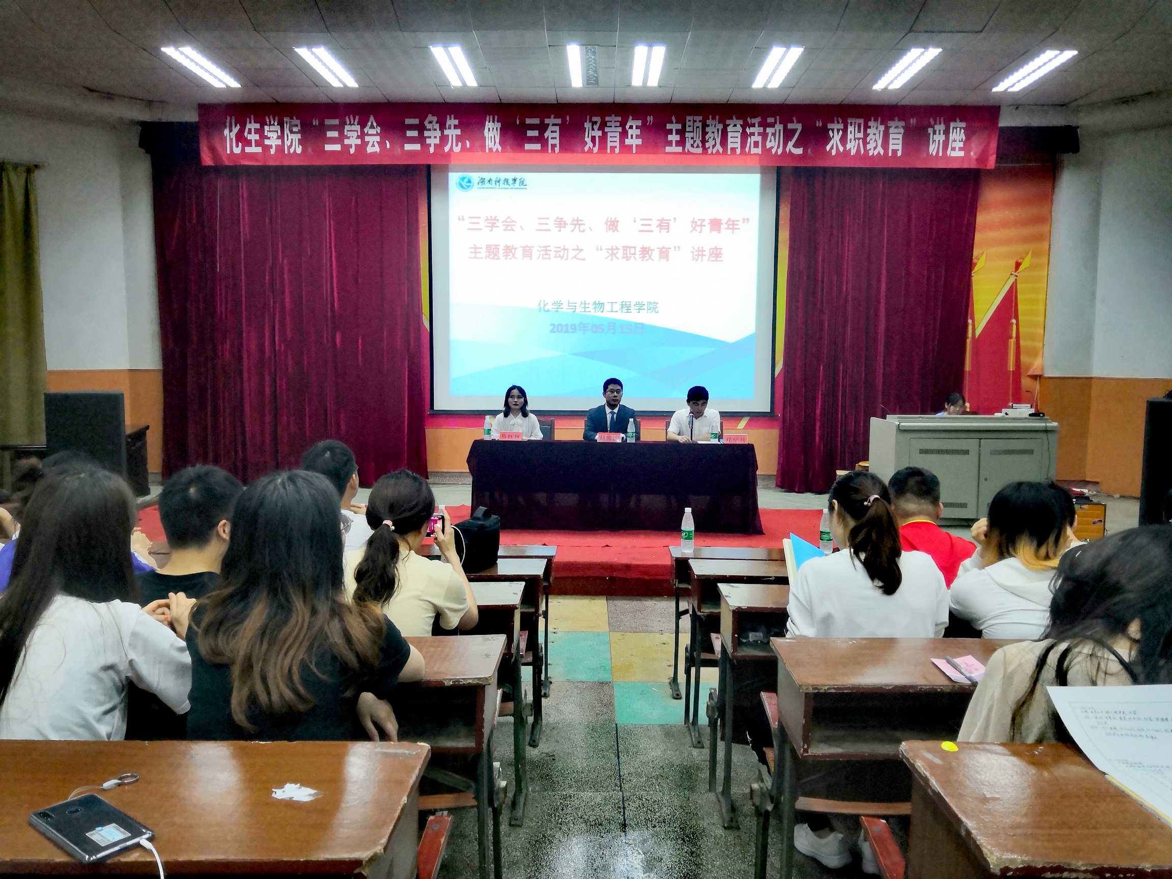 本网讯 5月15日晚,化学与生物工程学院联合正大天晴药业集团股份有限公司在明德楼举行“三学会、三争先、做‘三有’好青年”的主题求职教育讲座。