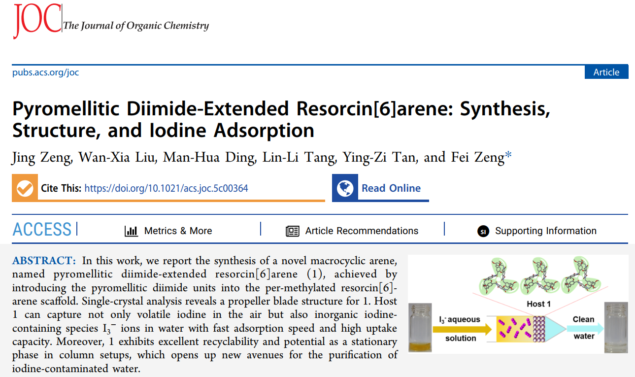 (本网讯 曾飞)近日,化学与生物工程学院2022级化学专业本科生曾靓以第一作者身份在The Journal Of Organic Chemistry期刊发表题为《Pyromellitic Diimide-Extended Resorcin[6]arene:Synthesis, Structure and Iodine Adsorption》的高水平科研论文。据悉,该研究得到了国家自然科学基金、湖南省自然科学基金、生物工程省级应用特色学科、湖南省大学生创新创业训练计划等项目的资助。