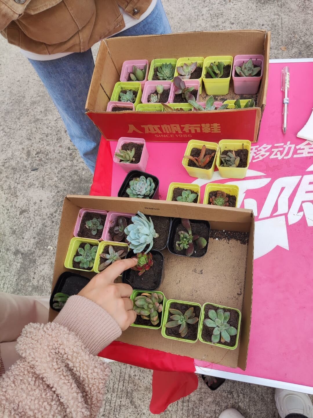 活动开始前,同学们收集了许多废弃的快递盒,用来换取饱满的绿植。活动进行中,桌子上整齐地摆放着一盆盆绿植,同学们井然有序的将快递盒交给工作人员后,精心挑选多肉并在留言板上写下自己的环保宣言和签名。