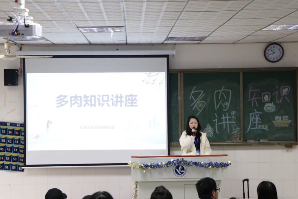 科创协会干事周小丁通过PPT从什么是多肉植物、多肉植物的生长条件、多肉植物的优点、怎样培养多肉植物以及多肉植物的作用等多个方面详细的介绍了多肉植物。同学们认真了解关于多肉植物的知识,详细了解关于多肉植物的培养注意事项。