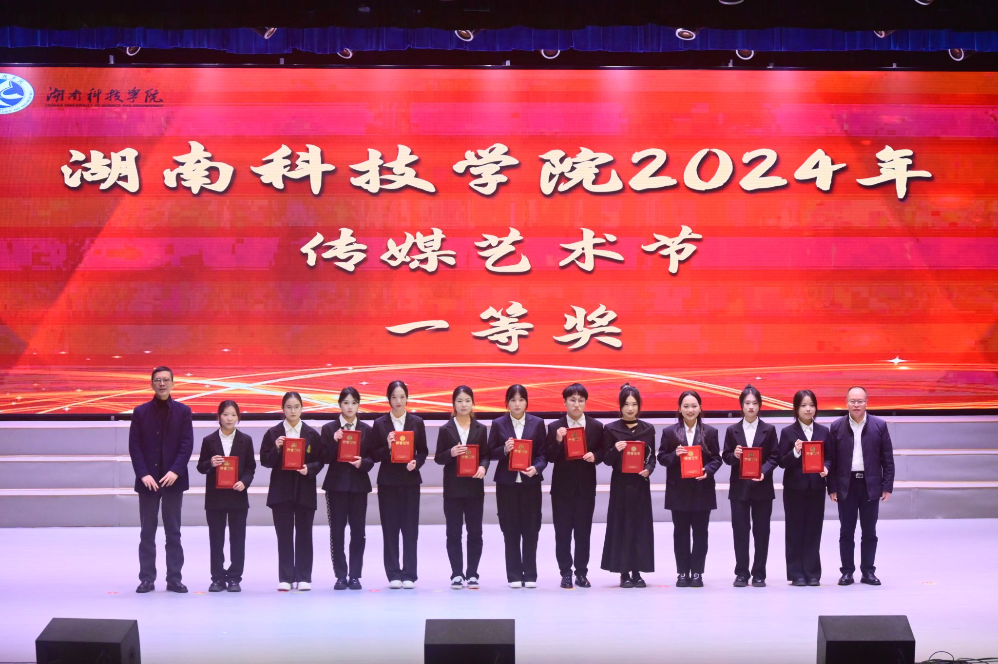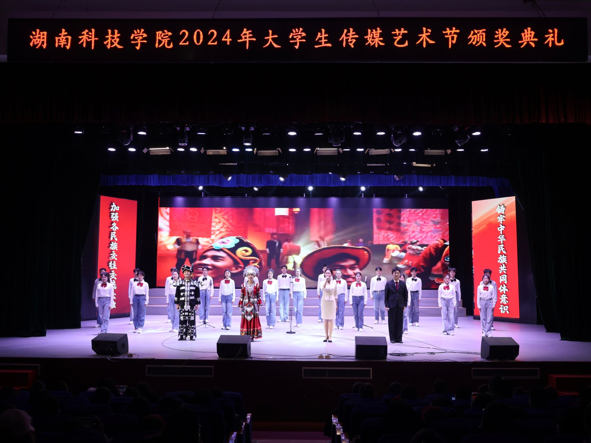 本网讯(记者 袁馨)12月12日晚,我校在音乐厅举办“和谐湘韵:铸牢中华民族共同体意识”大学生传媒艺术节颁奖晚会。校党委委员、纪委书记陈灿军,校党委委员、副校长何海,宣传统战部常务副部长林泽红,永州市融媒体中心新媒体与技术保障部主任赵小兵,零陵区委宣传部副部长龙咏雪出席晚会。