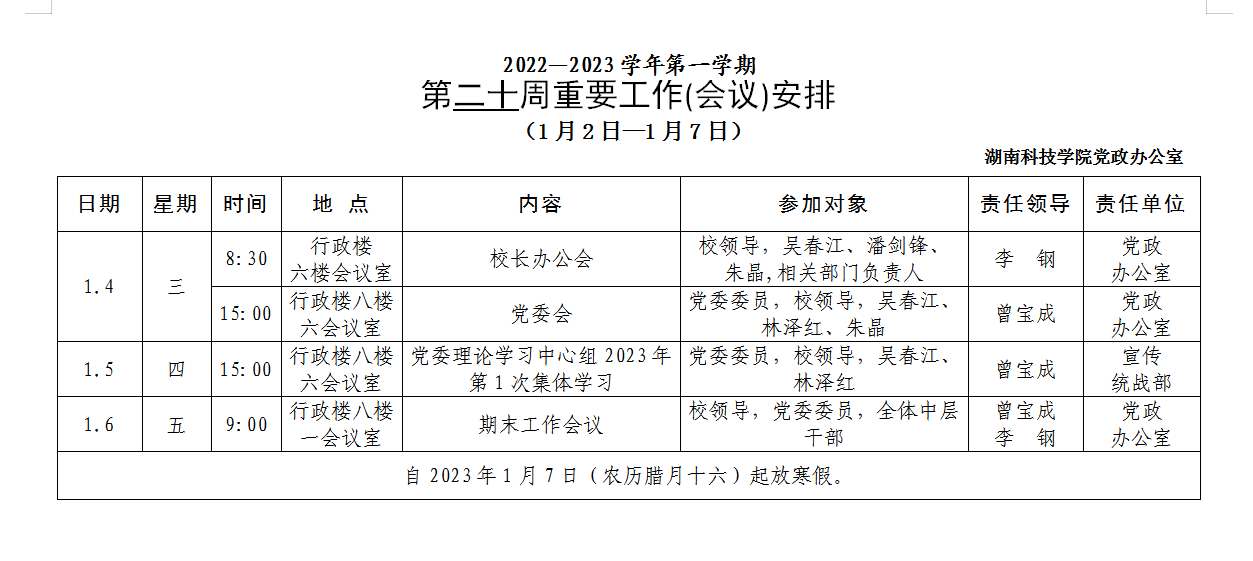 [党政办]第二十周重要工作(会议)安排(1月2日一1月7日)