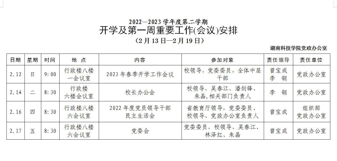 [党政办]第一周重要工作(会议)安排(2月13日一2月19日)