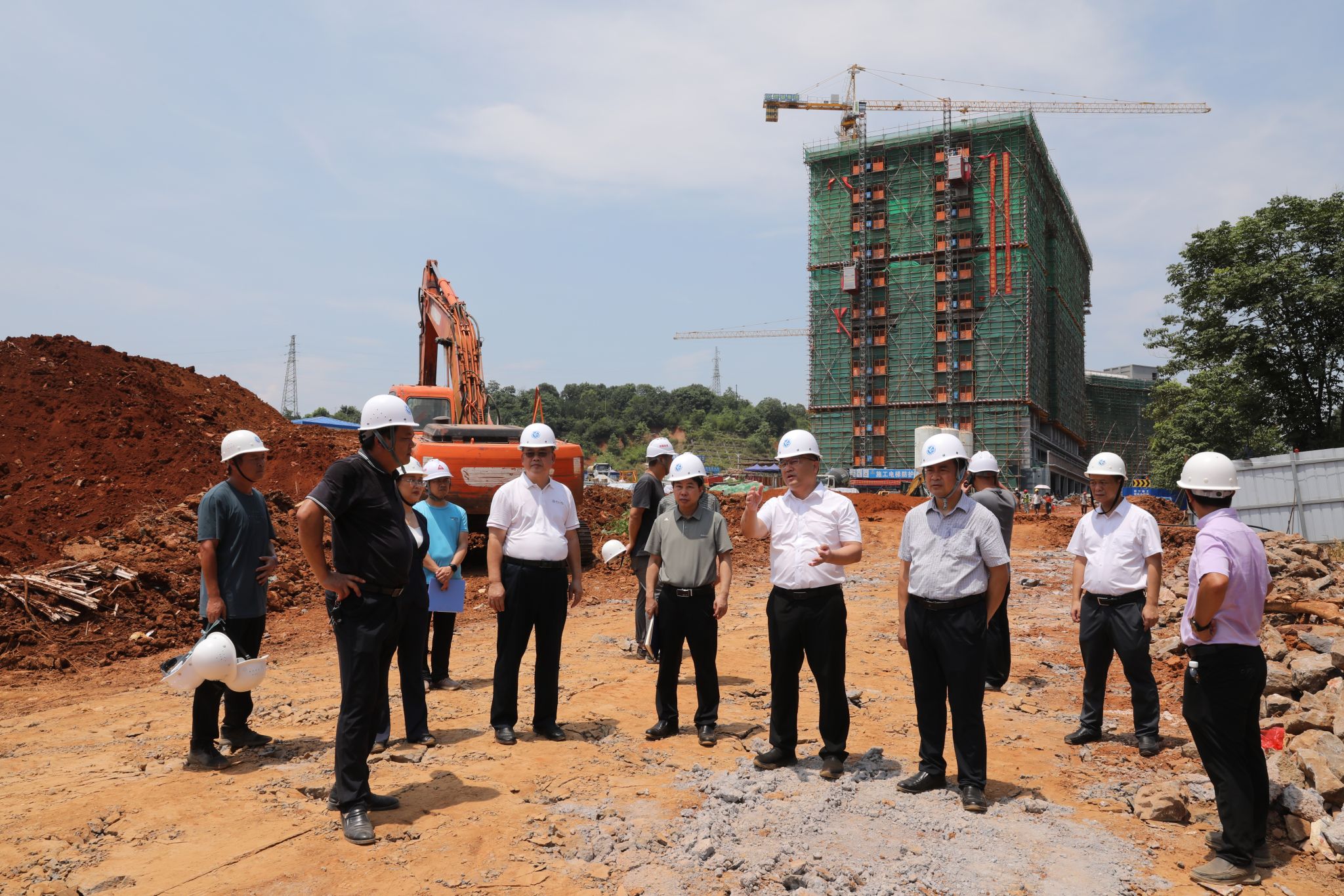 在新建学生公寓和食堂项目建设工地,施工现场,如火如荼。李钢和黄创霞代表学校,向坚守岗位的施工人员致以诚挚感谢,并反复叮嘱大家务必做好防暑降温,在保证施工安全的前提下积极推进工程进度。校领导还详细了解施工进展、施工条件等情况,对项目建设提出明确要求:要加强统筹协调,营造和谐有序的施工氛围;科学规划交叉施工环节,确保施工流程规范、高效;各职能部门要主动靠前服务,形成工作合力,以扎实举措保障施工安全顺利推进,确保项目按期高质量竣工,为师生创建舒适美好的学习工作生活环境。