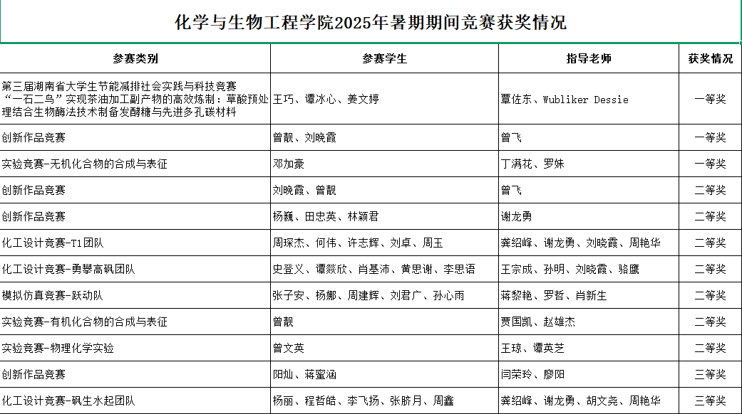 在第三届湖南省大学生节能减排社会实践与科技竞赛中,由化学与生物工程学院师生组成的参赛队伍,“一石二鸟”实现茶油加工副产物的高效炼制项目荣获一等奖。在第十五届湖南省大学生化学化工竞赛中,该院化学专业邓加豪获得实验竞赛“无机化学组”一等奖第一名,化学专业曾靓荣获“创新作品组”一等奖,在此项赛事中,该院共斩获一等奖2项,二等奖7项,三等奖2项。