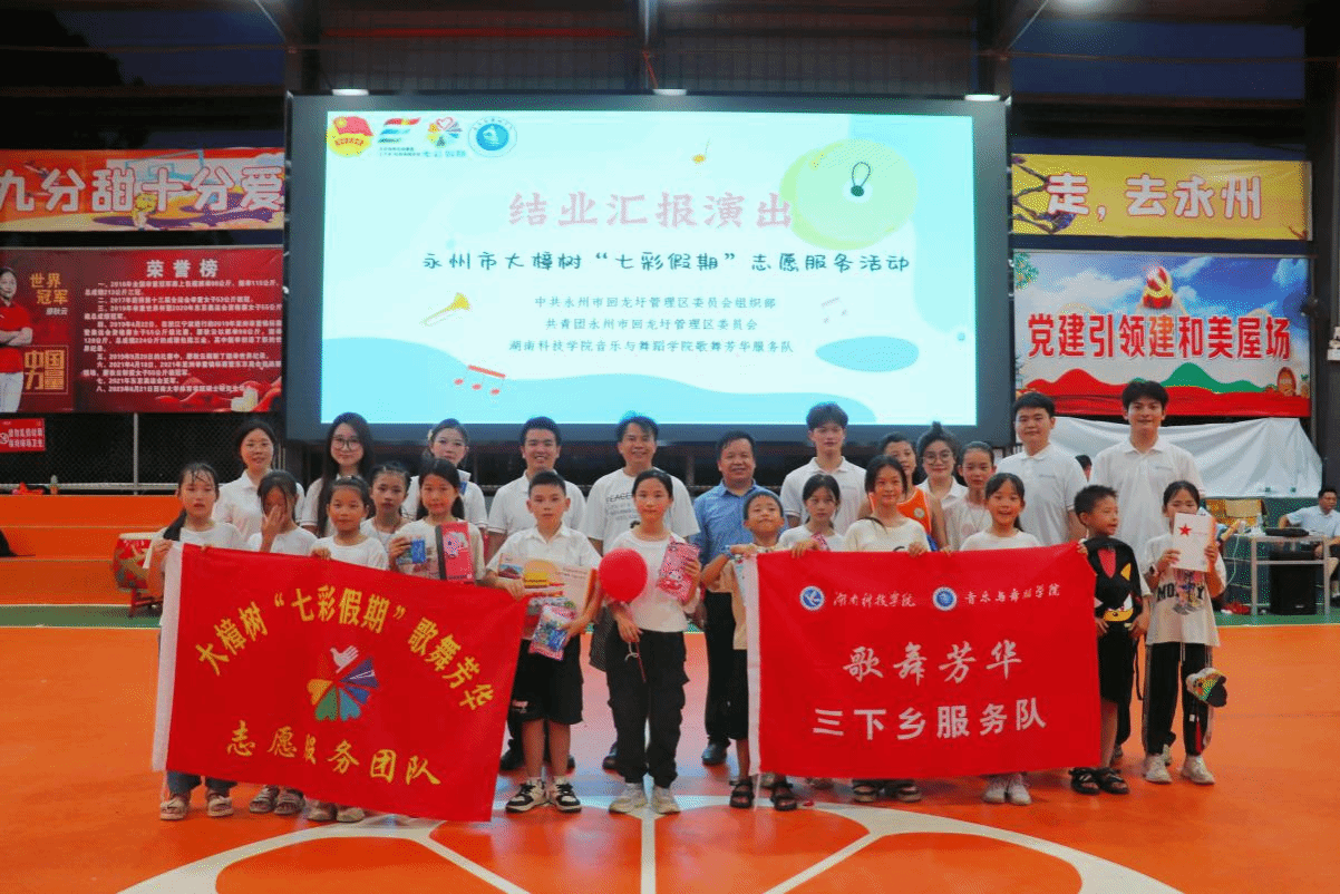 本网讯(通讯员 蒋毅 姚轩)7月16日晚,永州市回龙圩管理区村民活动中心灯火通明,音乐与舞蹈学院“歌舞芳华”三下乡服务队携手当地留守儿童,共同呈现“圩日·芳华”结业汇报演出,为15天的“七彩假期”志愿服务活动画上圆满句号。活动现场座无虚席,回龙圩管理区团区委书记王佳琦、回龙圩中学校长欧满清等与200余名村民共同见证这场充满温情的艺术盛宴。