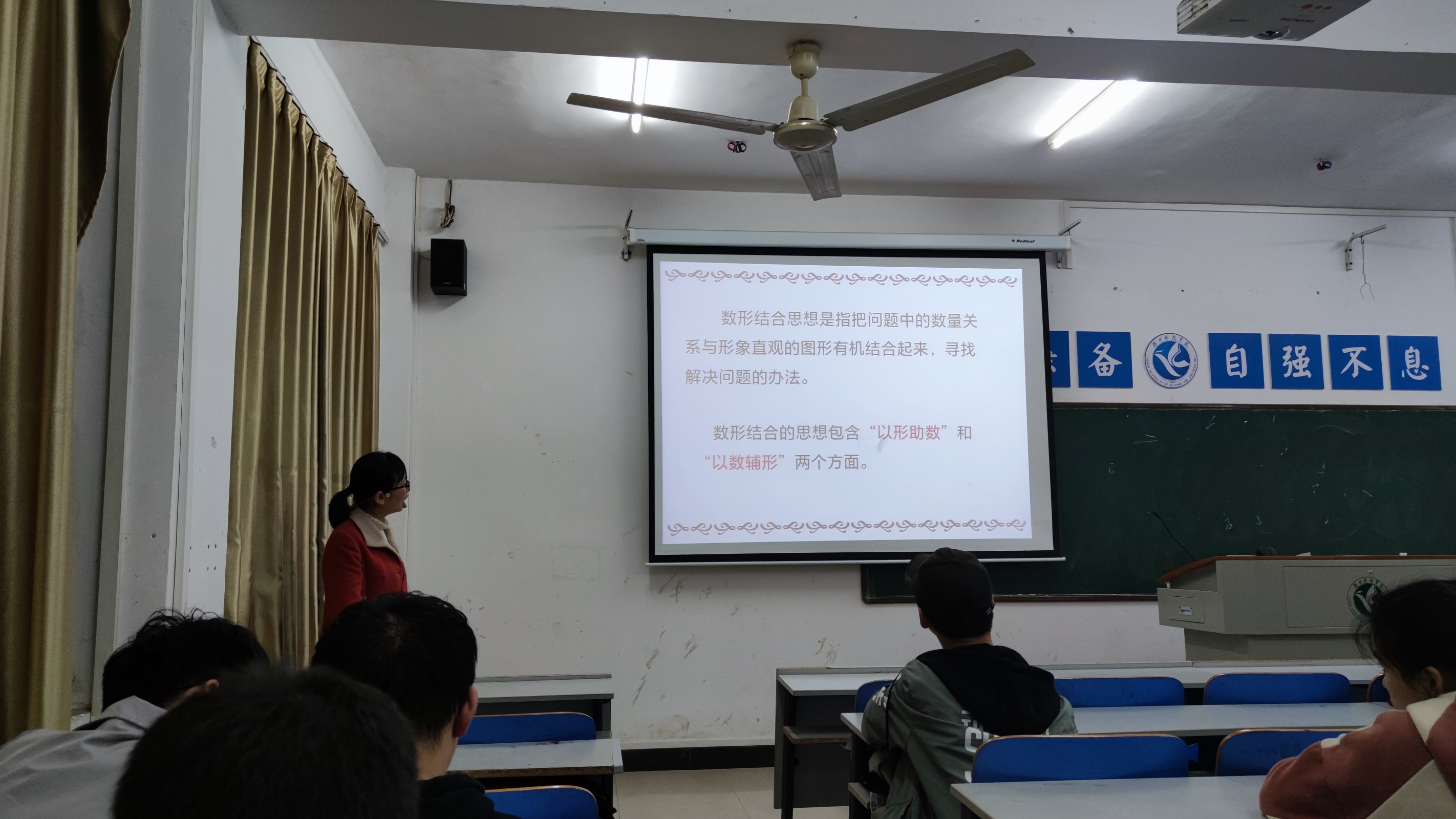 周宇剑介绍了转化思想、类比思想、数形结合思想、分类与整合思想四种数学思想。在介绍转化思想时,周宇剑利用经典的“牛喝水”问题引发了在座同学的数学兴趣,利用转化思想解决问题后,周宇剑表示:“转化思想时数学中的重要思想”。在周宇剑利用“数形结合思想”解决数学问题后,同学们纷纷感觉到“以形助数”和“以数辅形”的直观和生动的特点。
