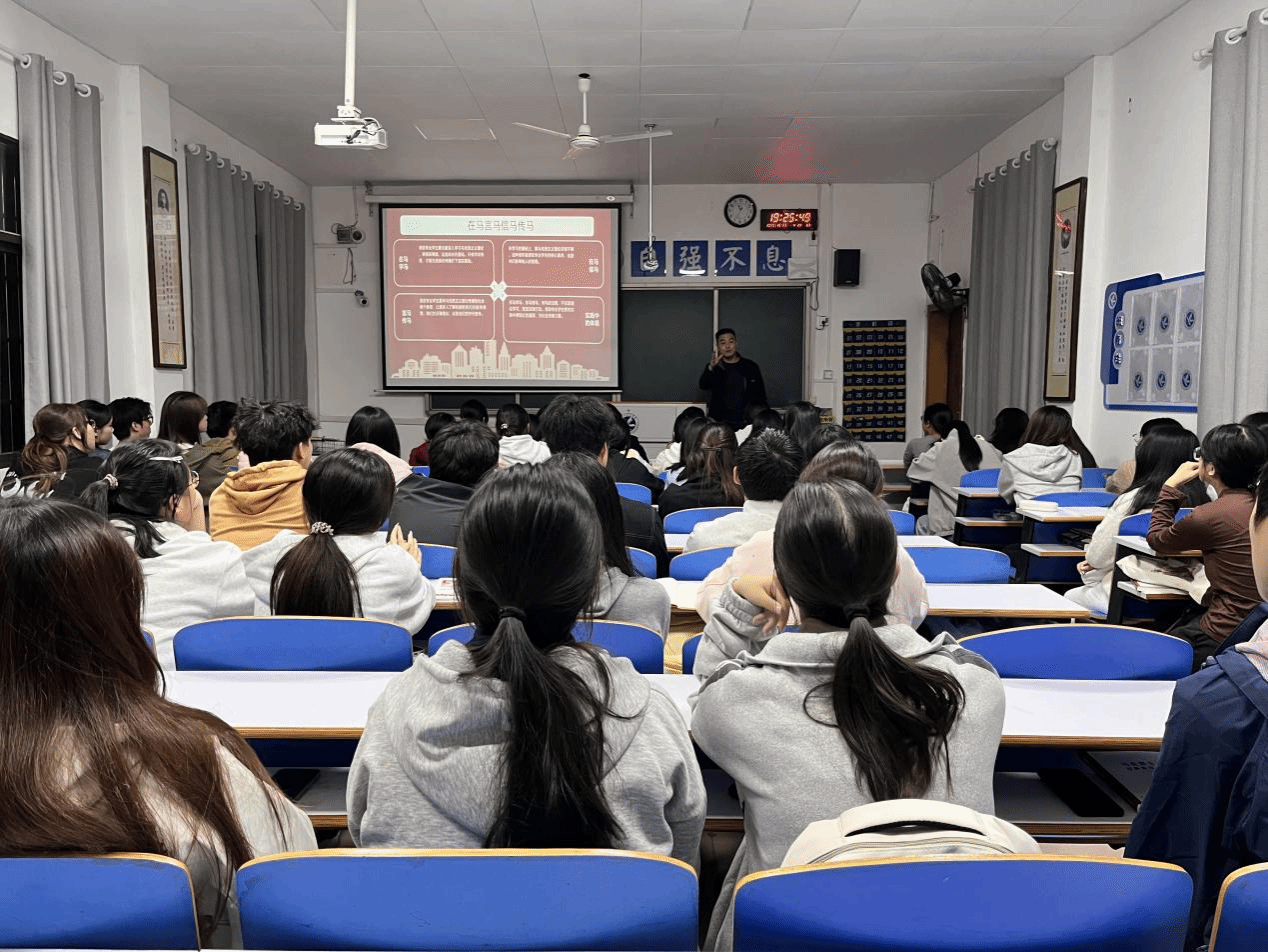 讲座围绕“理想信念”“大学生活”与“未来规划”三大主题展开,高丹强调:“作为马克思主义学院的学生,必须具备高度的爱国主义思想觉悟。”同时,通过一系列真实事例,帮助同学们强化文明恋爱、安全兼职、交通安全、心理健康等方面的意识,并建议大家科学合理安排时间,提高学习与效率。针对新生普遍关注的就业与发展焦虑,高丹结合当前思想政治教育领域就业形势,清晰解读未来职业发展方向,并分享往届学长学姐考研备考、院校选择、复试准备等宝贵经验,引导同学们树立正确的价值观与积极的学习态度。为新生搭建起“当下学习—未来发展”的清晰规划,有效缓解了大家的困惑。