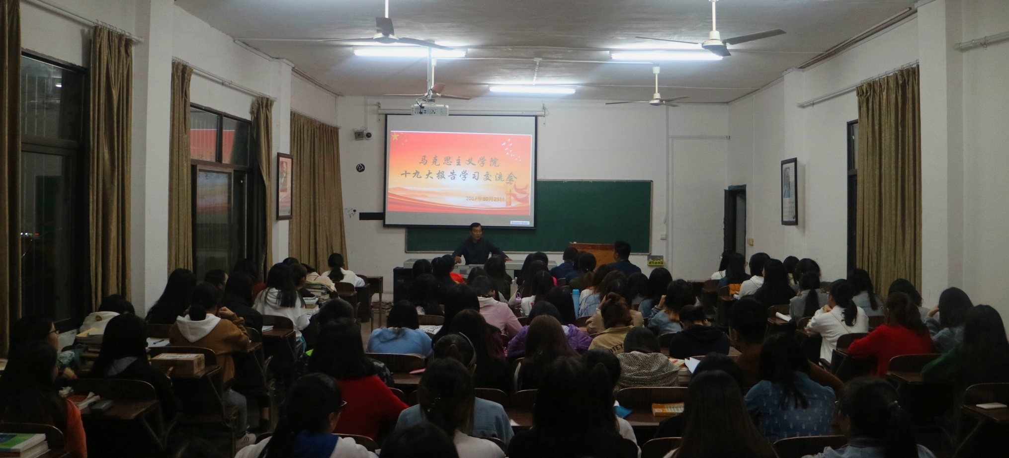 本网讯(通讯员贺茶湘彭超)10月23日晚,马克思主义学院在鹤鸣楼举办学习党的十九大报告交流会,该院2015级、2016级学生共聚一堂,畅所欲言,分享交流学习十九大报告的心得体会。