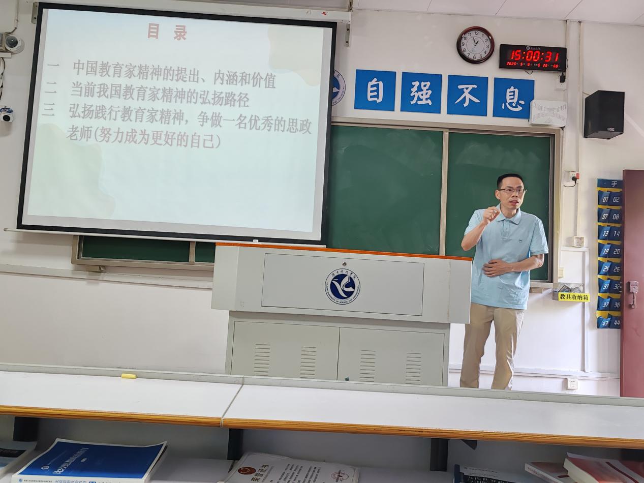 本网讯(记者 邓晶)5月28号,马克思主义学院特邀四位中学思政课骨干教师邓东海、李国润、彭国超、廖雅芸走进大学课堂,开展中学思想政治课名师讲座活动,聚焦“传经送宝赋新能,示范引领促成长”目标,为未来思政教师注入实践动能,我院22级全体在校学生参与。