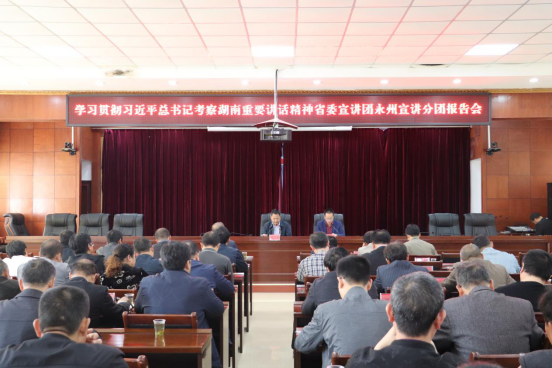 本网讯 (通讯员 李艳)近日,省委宣讲团永州宣讲分团成员、马克思主义学院副院长杨军教授应邀在蓝山、新田、回龙圩管理处等地宣讲习近平总书记考察湖南重要讲话精神。每场宣讲持续近两小时,吸引了近千名党员群众参与。