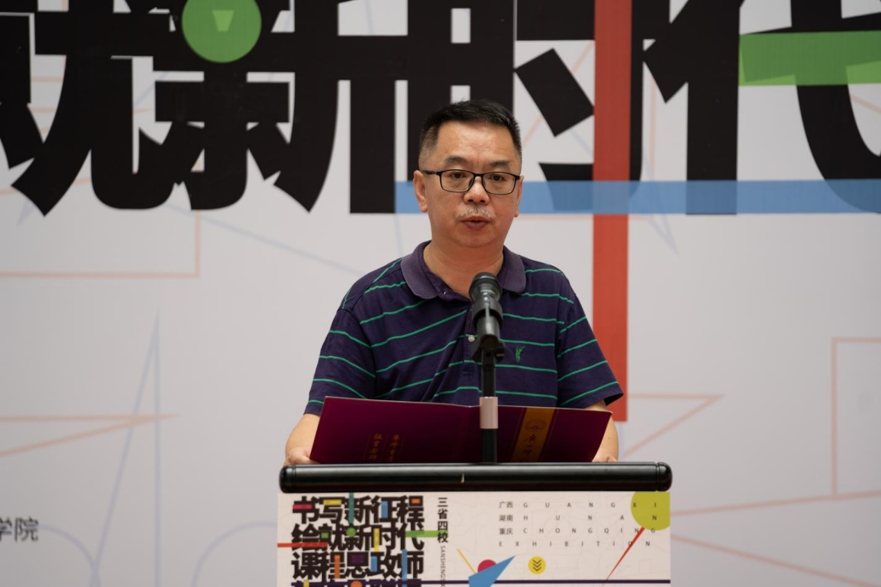 本网讯(通讯员 唐天田)7月1日,由广西师范大学美术学院、西南大学美术学院、万搏平台美术与艺术设计学院、河池学院美术与设计学院联合主办,广西师范大学校党委宣传部、美术学院联合承办的“书写新征程,绘就新时代”三省四校课程思政美术作品联展在广西师范大学纯道楼展厅开幕。我校美术与艺术设计学院院长张建利出席开幕式并致辞。