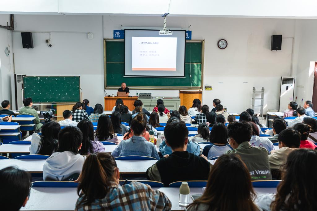 肖鹰以古希腊的雕塑艺术为例,分析与鉴赏了大量的中西古典艺术照片,阐释了西方艺术的人体理想和中国艺术的人格意境,从美学的视角深入浅出地对比西方艺术和中国艺术,让在座的师生耳目一新,享受了一次美学大餐。