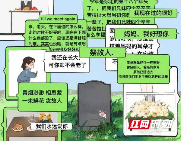 红网时刻新闻4月4日讯(通讯员 宁央贝 黄宇莹)清明将至,哀思渐浓。然疫情防控形势严峻复杂,为倡导文明祭扫新风,传承优良家风。4月2日,万搏平台美术与艺术设计学院学生以绘画的形式提倡大家清明扫墓采用网上“云祭扫”、居家追思、植树缅怀等绿色、环保、安全的祭祀方式进行。