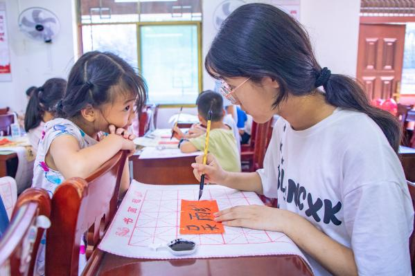 本网讯(通讯员 陶鑫怡 武赟霞)7月16日,在怀化通道侗族自治县皇都村,美术与艺术设计学院“向阳花”志愿服务队为侗乡青少年带来了一场“墨香传廉意,文化润乡村”的书法学习活动。
