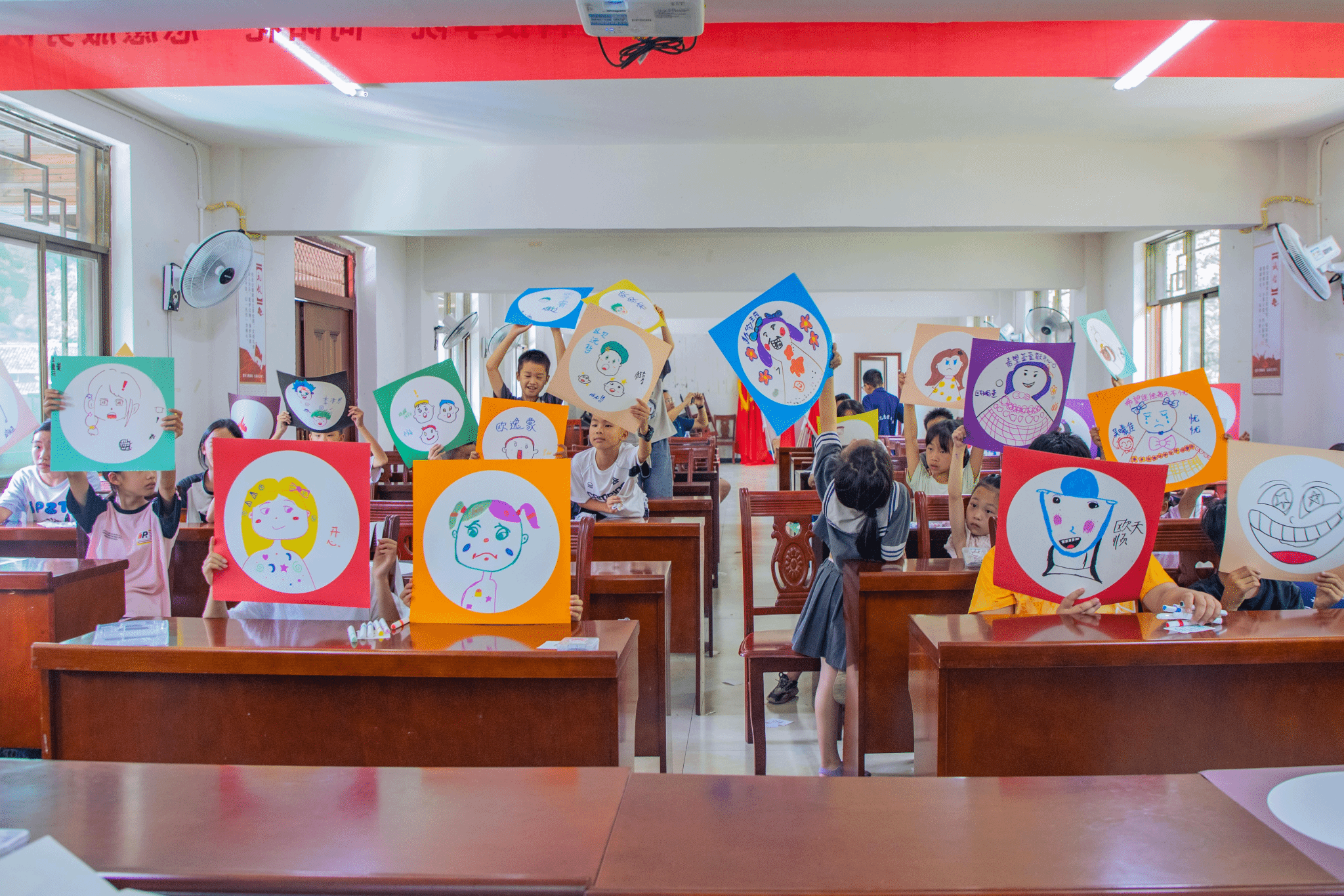 随后,向阳花队的志愿者们与孩子们携手,一边交流一边在方圆卡纸上精心绘制出“情绪头像”。一笔呈表情,一笔注情感,让孩子们尝试情绪表达,学会传递和交流情绪。一幅画作,一种色彩都蕴含着孩子们的真情实感,志愿者的帮辅让他们积极乐观、自我悦纳,学会了情绪调节的方法,在一片欢声笑语中健康成长。