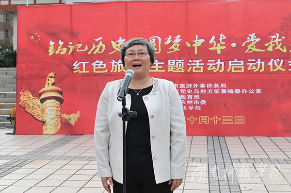 本网讯(记者 黄丽丽 王翩翩 摄影 何帅文)为纪念中国人民抗日战争暨世界反法西斯战争胜利70周年,更好地挖掘和丰富红色旅游资源的思想内涵。10月13日下午,“铭记历史•圆梦中华•爱我永州”红色旅游主题活动启动仪式在我校举行。永州市委常委、市委宣传部部长石艳萍出席并宣布活动启动,校长曾宝成致辞。