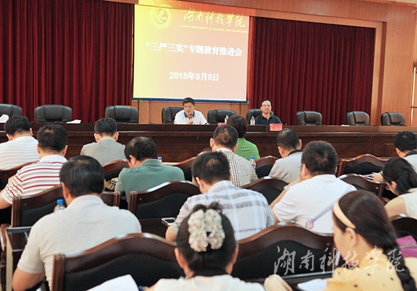 本网讯 (记者周芬 摄影 何帅文)为总结前一阶段“三严三实”专题教育开展情况,更好地抓好下一阶段的工作,9月8日,我校在行政办公楼八楼会议召开“三严三实”专题教育工作推进会。校党委书记陈弘强调,要把专题教育与学校中心工作紧密结合起来,切实把专题教育抓好抓出成效来。校党委副书记唐艳明就做好下一阶段工作提出具体要求。