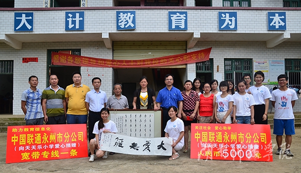 当日下午,中国联通永州市分公司副总经理蒋毅和市场部经理李辉在县联通负责人的陪同下,向天天乐小学爱心捐赠现金五千元善款并捐赠宽带专线一条,并鼓励队员们再接再厉,把正能量传承下去。