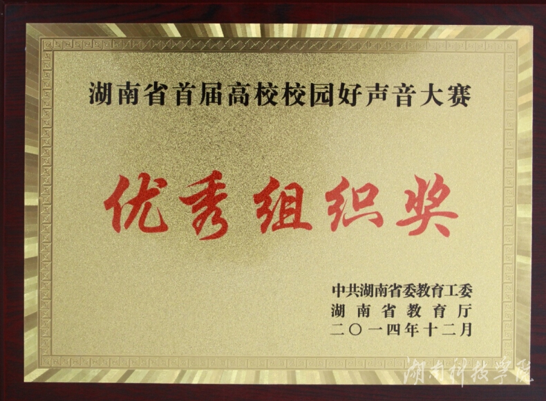 本次大赛由湖南省教育工委、湖南省教育厅主办,系教育部思想政治工作司力推的“全国校园好声音”湖南分区的赛事,于2014年9月启动,全省近百所高校、逾万人报名参赛。经过层层筛选,校团委选送了音乐与舞蹈学院魏文轩、武雯、凌佳宇、崔英涛、刘翠娟5名同学代表我校参赛。大赛组委会组织评审团对各参赛学校寄送的参赛DVD光盘,并结合各校在易班网上的人气排名积分进行综合评定。经过严格评选,我校在入围第二轮比赛的30个学校中排名第11,荣获“优秀组织奖”。