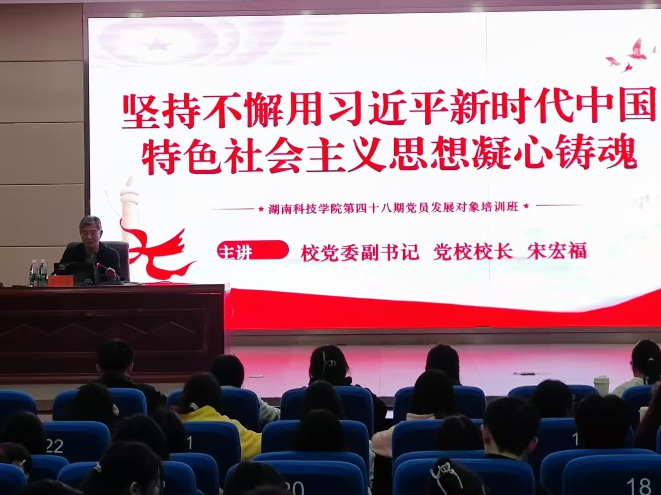 随后,宋宏福以《坚持不懈用习近平新时代中国特色社会主义思想凝心铸魂》为题,从历史维度、理论维度、时空维度、方法论维度等四个维度系统阐释了习近平新时代中国特色社会主义思想的精神实质和思想内涵。他强调,党员发展对象应当做到真学真信、拥护核心、担当作为、锤炼党性,在推进中国式现代化的进程中彰显新时代青年的担当与责任。