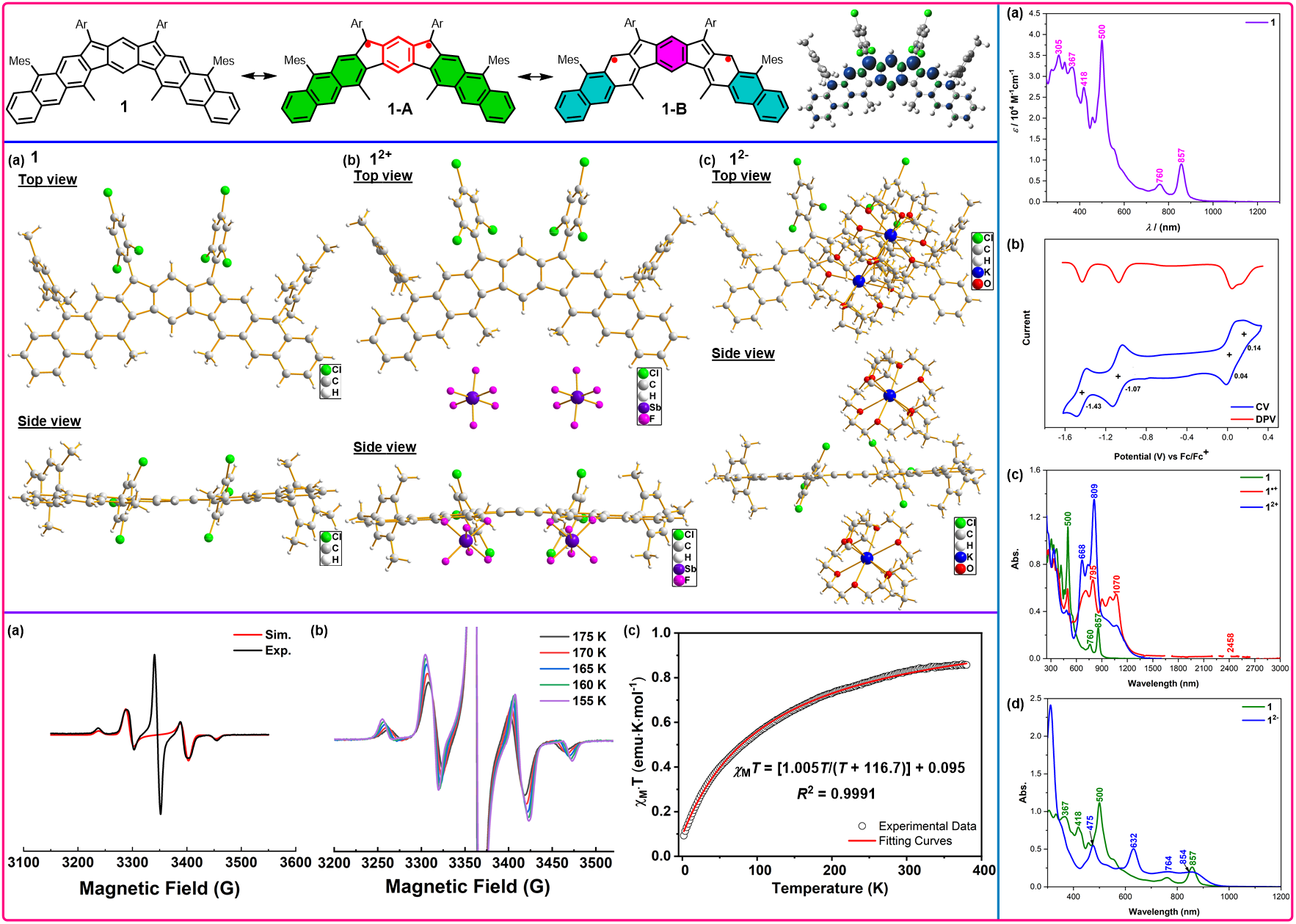 基于此,蒋清博士课题组提出了一种“π-扩展”策略,通过在茚并芴骨架两端融合两个萘环,成功地调控了双自由基的基态自旋多重度,获得了一种稳定的基态为三线态的双自由基分子。该化合物的三线态基态通过电子顺磁共振和超导量子干涉仪测量得以证实,并通过实验和理论计算系统地研究了其电子性质。同时,该双自由基化合物在空气和光照条件下表现出良好的稳定性,其半衰期达到64 h。此外,它具有窄的HOMO-LUMO能隙,并且表现出两性氧化还原行为。其二阳离子和二阴离子展现了闭壳层基态和近红外吸收,结构通过X射线晶体学分析确认。此研究成果不仅为开壳层多环芳烃开辟了新的研究空间,还为其他高自旋Kekulé型有机 π-共轭自由基分子的设计和合成提供了新的思路。该成果获得了湖南省生物工程应用特色学科与湖南省高层次人才支持计划资助。