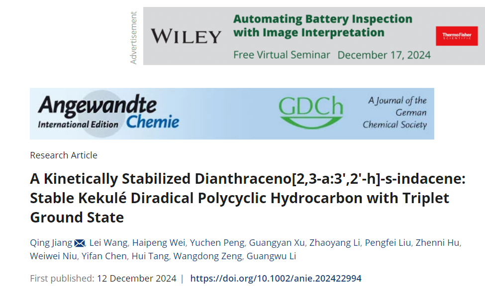 本网讯(通讯员 袁志辉)近日,化学顶级权威期刊《Angewandte Chemie International Edition 》在线刊登了我校化学与生物工程学院蒋清课题组的研究论文“A Kinetically Stabilized Dianthraceno[2,3-a:3',2'-h]-s-indacene: Stable Kekulé Diradical Polycyclic Hydrocarbon with Triplet Ground State”(稳定的三线态基态dianthraceno[2,3-a:3',2'-h]-s-indacene双自由基分子),文章的第一和通讯作者为蒋清博士,我校为第一和唯一通讯单位。实现了我校在该研究领域的新突破。