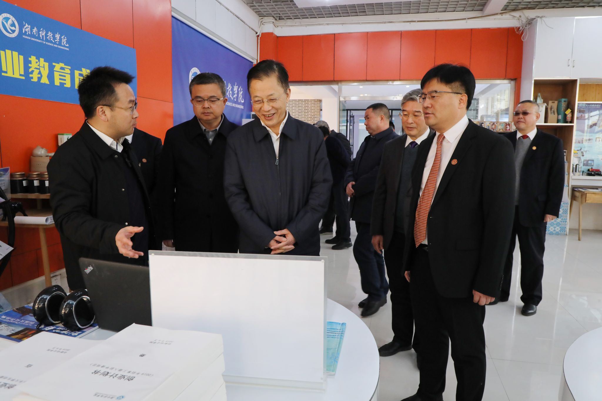 省教育厅办公室主任崔恒源、财务建设处处长黄星亮、高等教育处处长张平、学位管理与研究生教育处处长颜胜利,永州市教育局党组书记、局长黄赞校,以及学校有5关9部门、学院负责人参加调研。