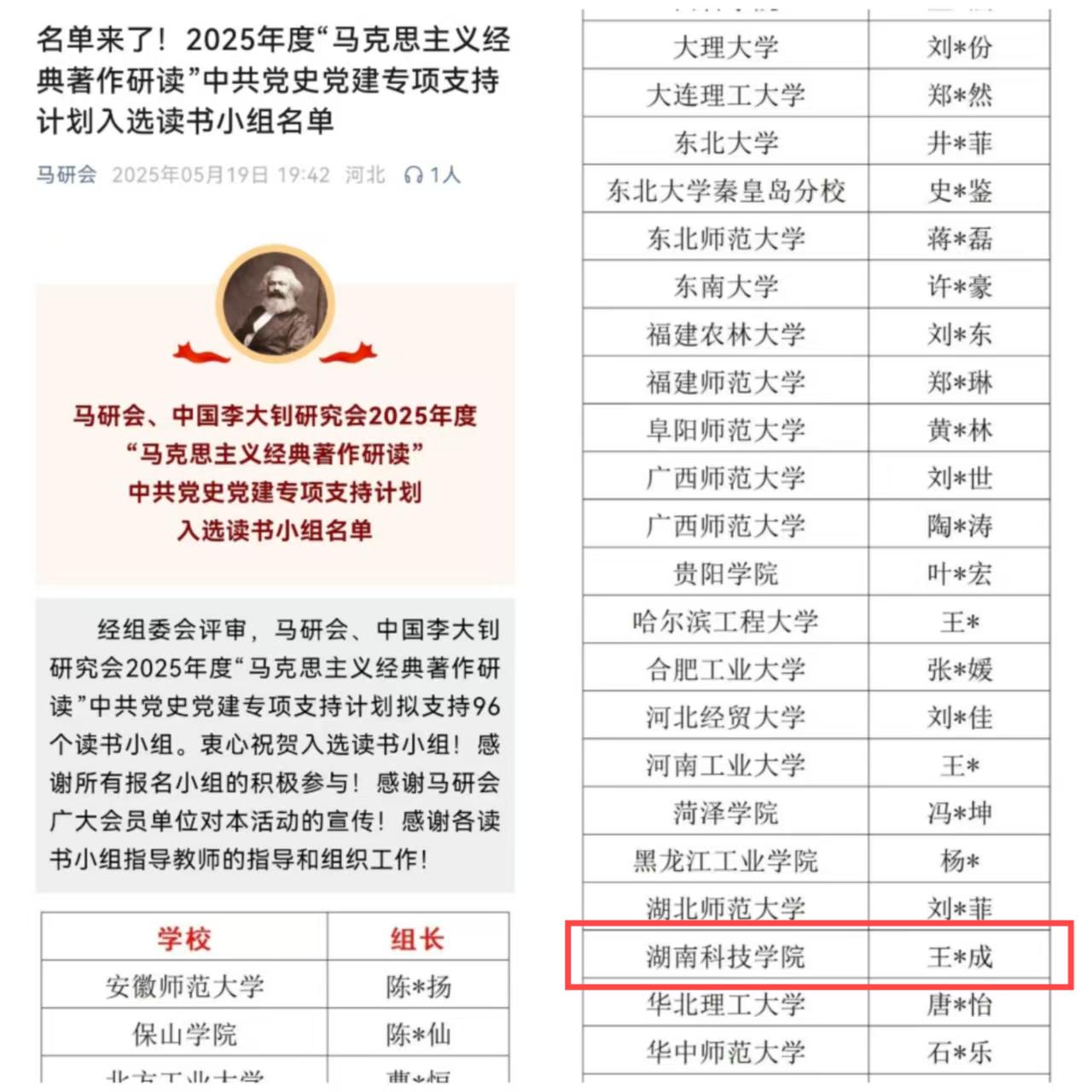 本网讯(通讯员 王志成 曹惠如)5月19日,中国高等教育学会马克思主义研究分会(以下简称“马研会”)、中国李大钊研究会2025年度“马克思主义经典著作研读”中共党史党建读书小组专项支持计划立项名单正式公布,来自北京大学、吉林大学等高校的96个读书小组入选。其中,我校《李达全集》读书小组成功入选,这既是我校学生读书小组首次入选全国“马克思主义经典著作研读”资助计划,也是本次湖南省唯一立项的学生读书小组。