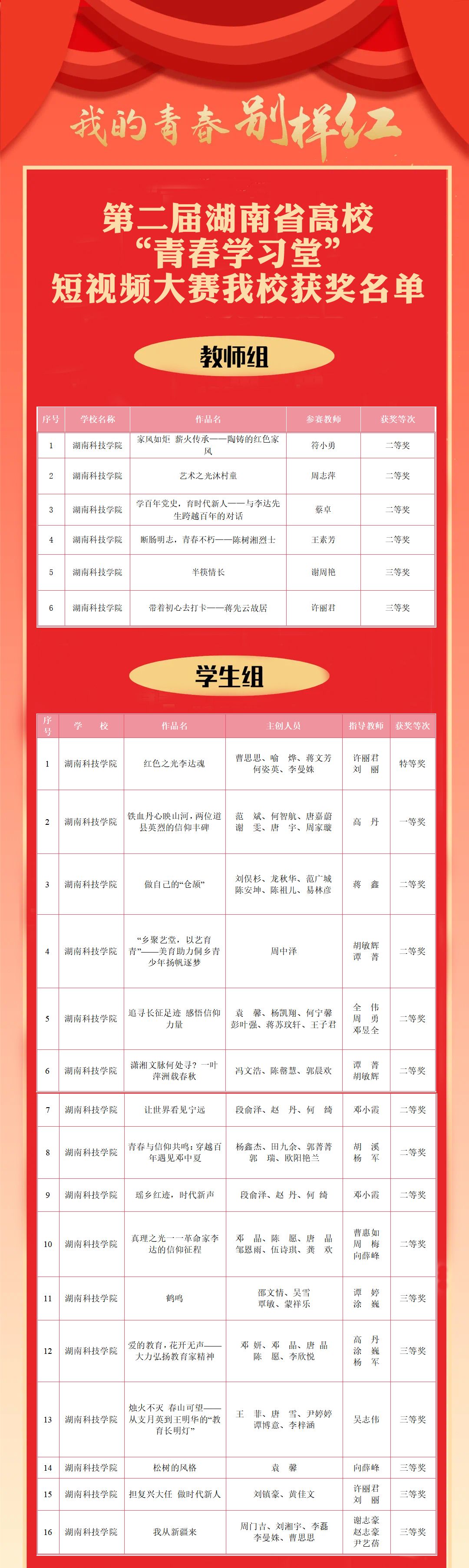 本网讯(记者 孙淑娴)近日,由中共湖南省委教育工委、湖南省教育厅、湖南日报社联合主办的湖南省第二届高校“青春学习堂”短视频大赛评选结果揭晓。我校师生在赛事中表现优异,斩获特等奖1项、一等奖1项、二等奖12项、三等奖8项,并荣获“优秀组织奖”,充分展现了学校扎实推进思政教育的阶段性成果。