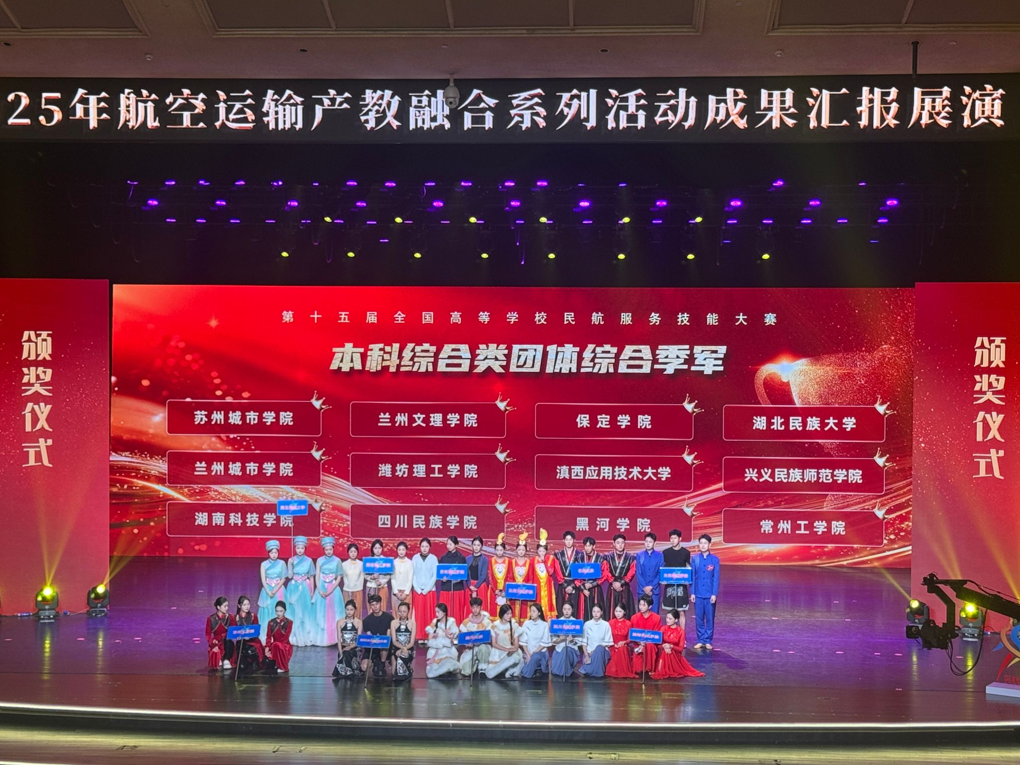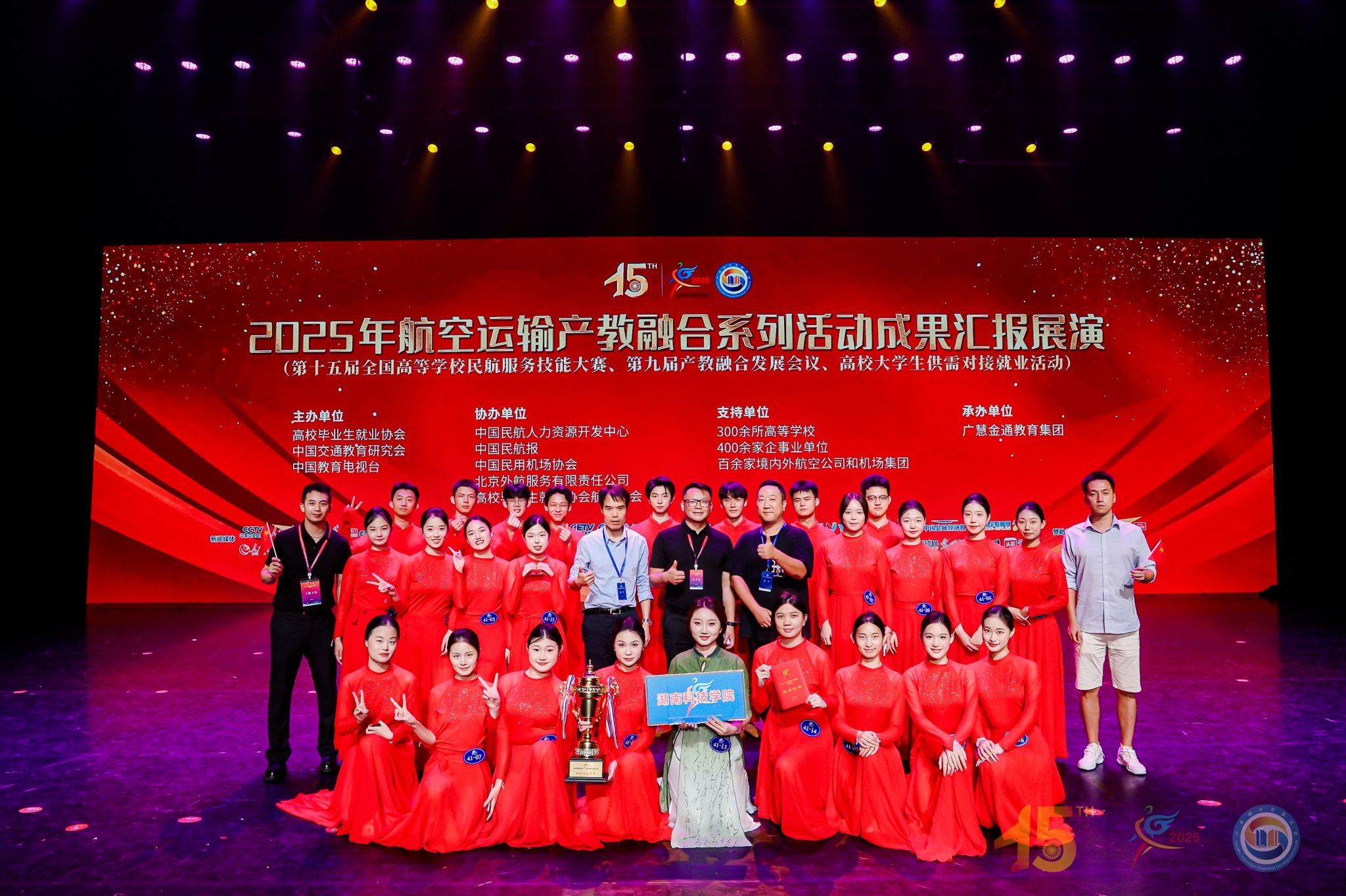 本次大赛作为2025年航空运输产教融合系列活动中的重要一环,由高校毕业生就业协会、中国交通教育研究会、中国教育电视台主办,吸引了全国百余所高校参赛,竞争异常激烈。我校代表队凭借扎实的专业功底、精湛的服务技能和出色的团队协作,在客舱服务、应急处理、职业形象展示和团体舞蹈剧目等环节中表现亮眼,最终斩获团体综合季军的殊荣。