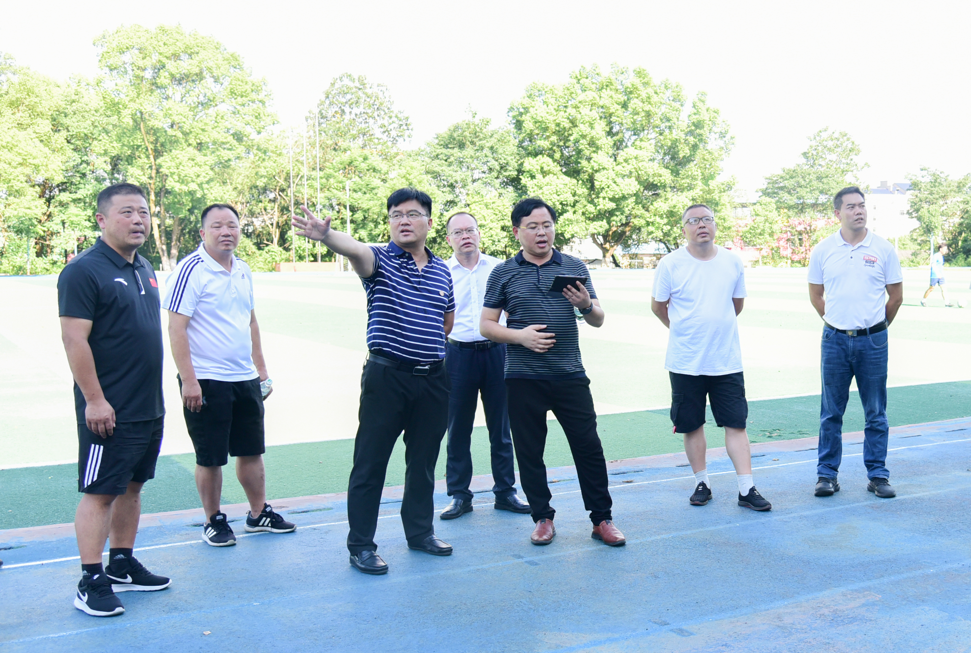 李钢一行还现场察看了田径场地部分区域,对田径运动场提质改造工程实施方案提出了意见,关于优化主席台建设、田径场东侧加围栏、美化看台等问题,他强调,基建处要节约开支,确保质量,抢抓时间,切实提升师生的幸福感和获得感。