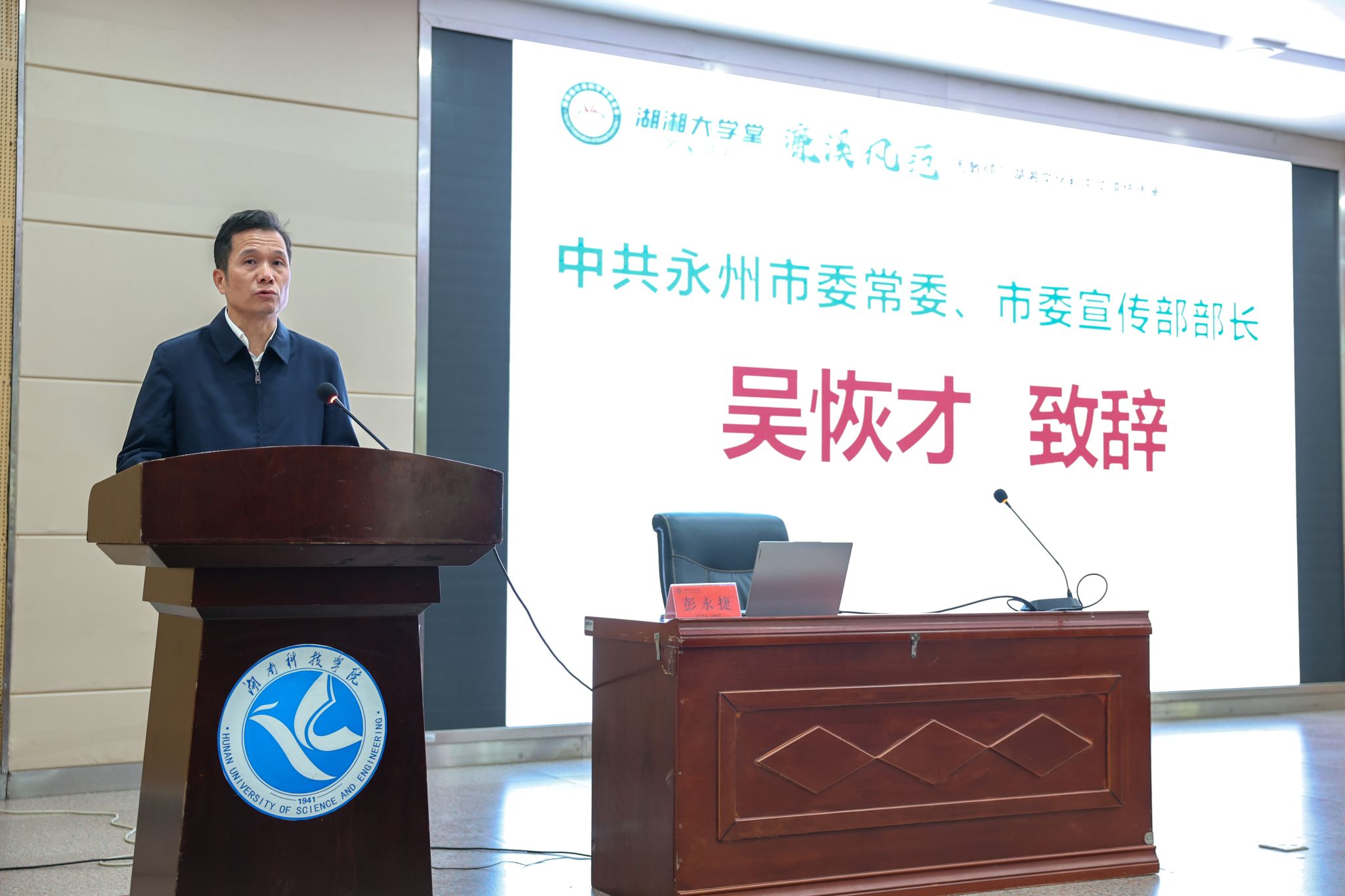 本网讯(通讯员 黄渊基 张琳 摄影 朱浩然)10月31日,由中共湖南省委宣传部、湖南省社科联主办,我校承办的2025年第3期湖湘大学堂·名家讲坛在我校开讲。本期活动特邀中国人民大学哲学院教授、博士生导师,中国人民大学孔子研究院院长,中国实学研究会和合文化专委会会长彭永捷教授担任主讲人,以《周敦颐与湖湘文化和中华道统传承》为主题进行授课。湖南省社科联党组书记、副主席(主持日常工作)胡代松,永州市委常委、市委宣传部部长吴恢才,校党委书记李钢,党委副书记、校长黄创霞,党委委员、副校长李常健参加活动。省社科联干部代表、永州市社科工作者代表、媒体记者、市民代表以及我校师生代表等近600人到现场聆听。