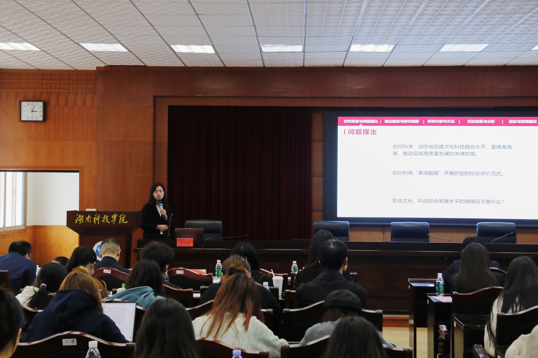 在交流发言环节,湖南农业大学经济学院郑毅以《科技赋能传统文化与旅游融合的机制构建与路径选择——以永州为例》为题,中南林业科技大学涉外学院禹文婷以《湖南省文化-旅游-数字产业发展态势与耦合协调研究》为题,湖南省社科联机关党委(人事部)杜宏丹以《AIGC的赋能与颠覆:文化产业内容生产的范式重构》为题,湘潭大学商学院闫宇晨以《制度型开放对城市创业的影响研究:来自跨境电商综合试验区的经验证据》为题,湘潭大学商学院周海欣以《数字普惠金融对制造业韧性的空间溢出效应研究——产业协同集聚的调节作用》为题,中南林业科技大学经济管理学院孙颖以《长江经济带文化与科技“两业融合”的产业升级效应研究》为题,湖南都市职业学院李茜以《音视频产业赋能湖南文化资源数字化发展研究》为题,湘潭大学法学学部扶紫媛以《民事诉讼中表情符号作为证据适用的现实困境与规范路径》为题,万搏平台蔡保忠以《数字文旅促进城乡共同富裕:作用机理与效应分析——基于中国县域面板数据的实证研究》为题,分享了文化和科技融合发展的研究心得与实践感悟。