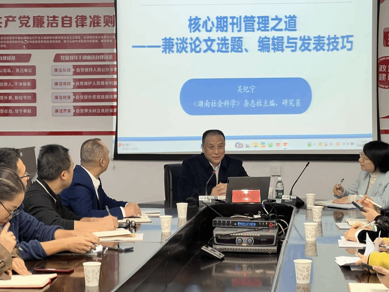 本网讯(通讯员 周嘉欣)10月31日下午,《湖南社会科学》杂志社主编、湖南省社科联研究员吴纪宁来校开展学术讲座,作了题为“核心期刊管理之道——兼谈论文选题、编辑与发表技巧”的精彩分享。各二级学院中青年教师代表及学报全体成员共40余人参加,讲座由学报副主编廖海燕主持。