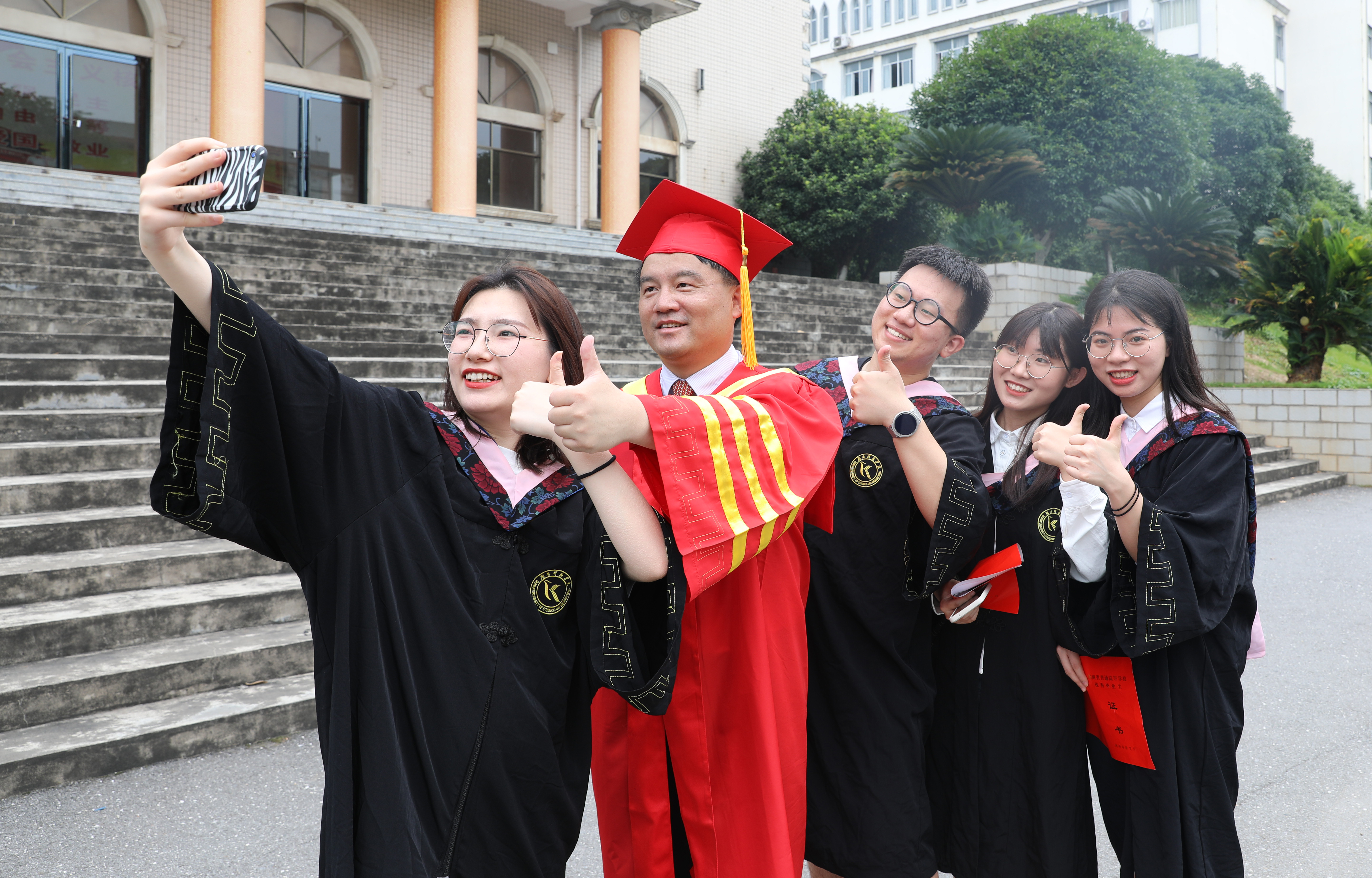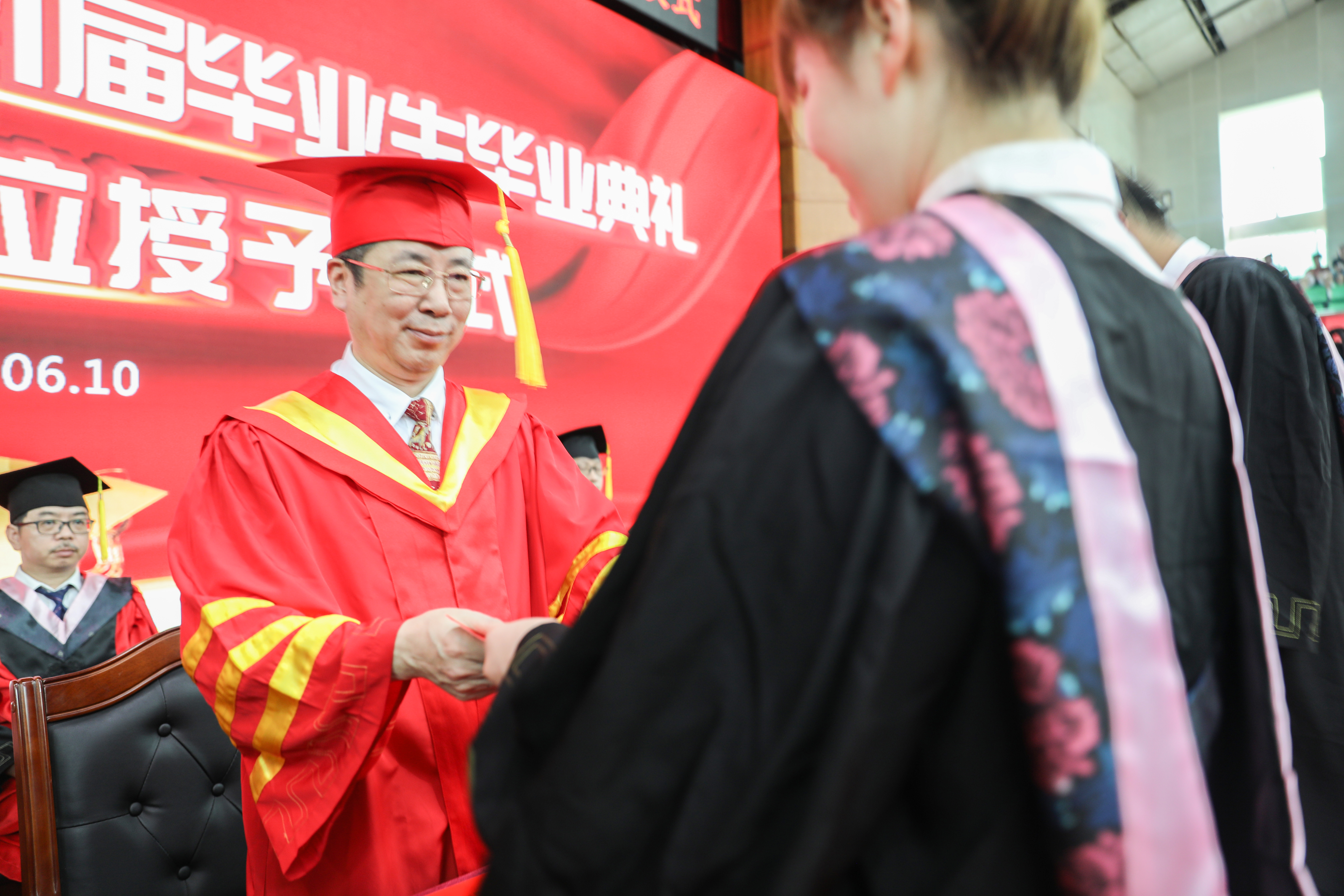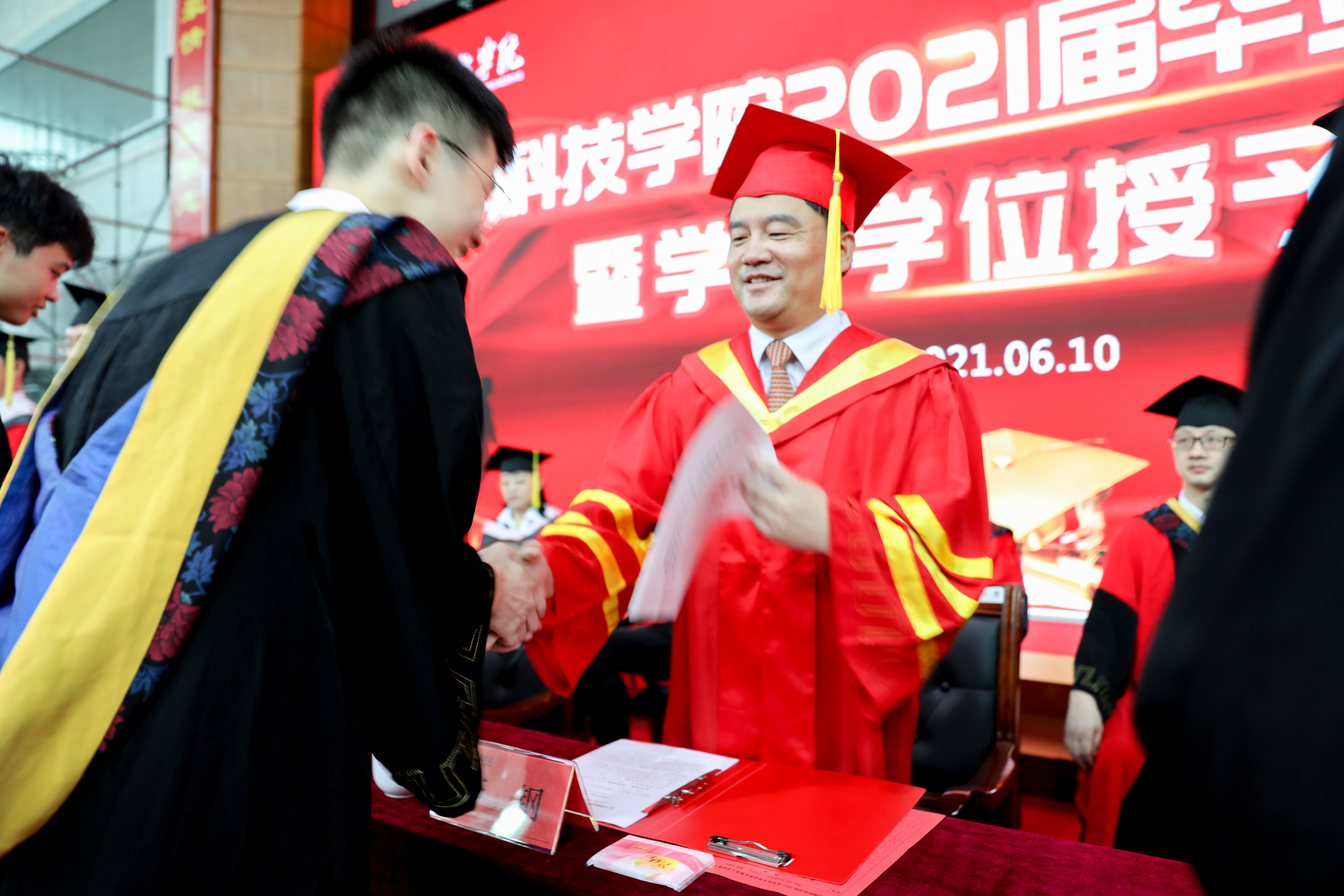 10点,学士学位授予仪式上,2021届毕业生们穿上整齐端庄的学士服,怀着激动的心情迎接这一人生中的庄重时刻。曾宝成、李钢等全体校领导面带微笑,和蔼可亲地为每一位毕业生拨穗正冠、颁发学位证书,并单独合影留念,留下独特回忆。同学们接过学位证书,深情地鞠躬致谢,学校的关怀和学成的喜悦,洋溢在每一位毕业生的脸上。