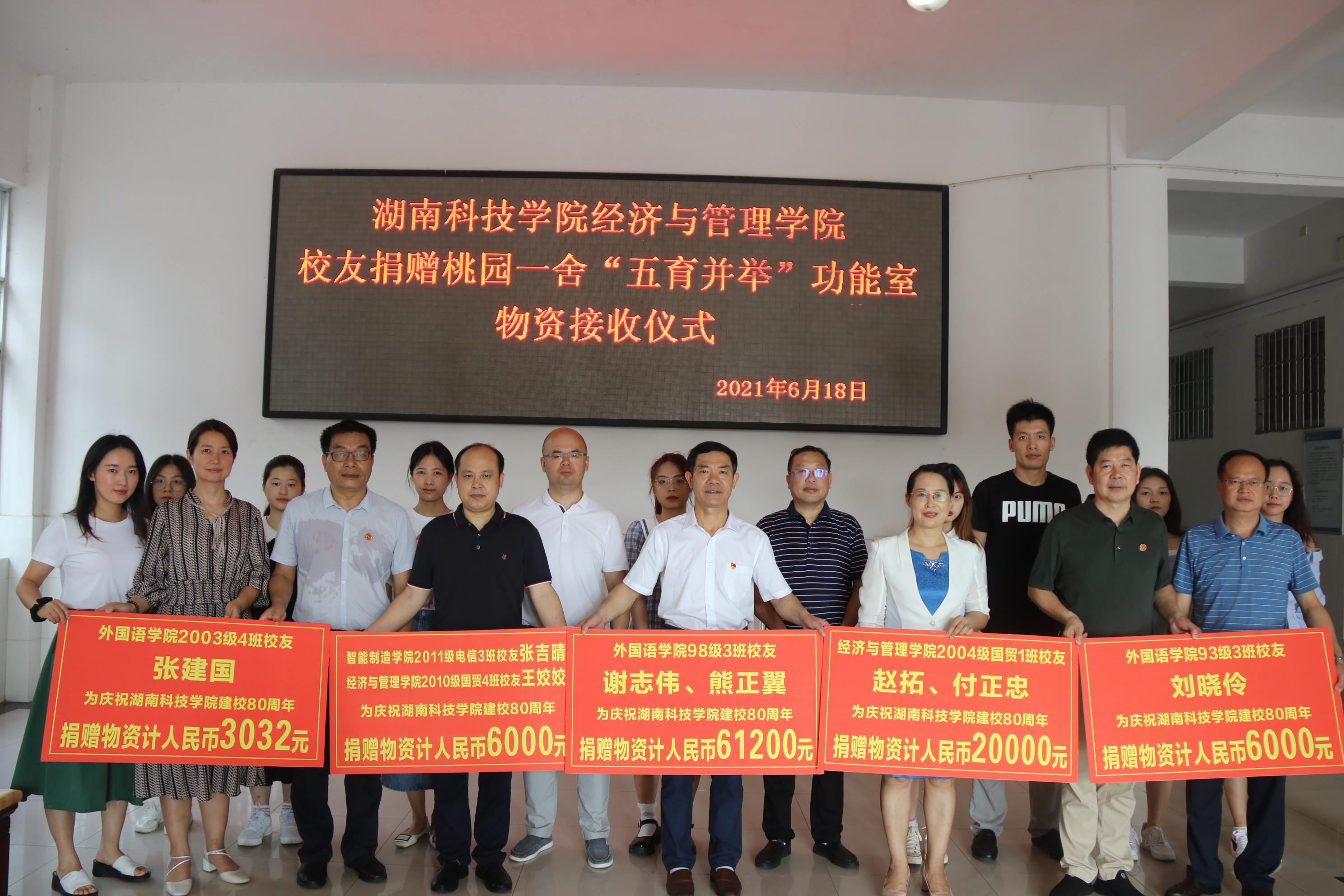 本网讯 6月18日,学校在立信楼举行校友捐赠桃园宿舍一栋“五育并举”功能室物资接收仪式,此次共有经济与管理学院、外国语学院、智能制造学院的8名优秀校友自发捐赠物资共计96232元。党委委员、副校长吴小林,副校长郑银芳出席捐赠仪式。