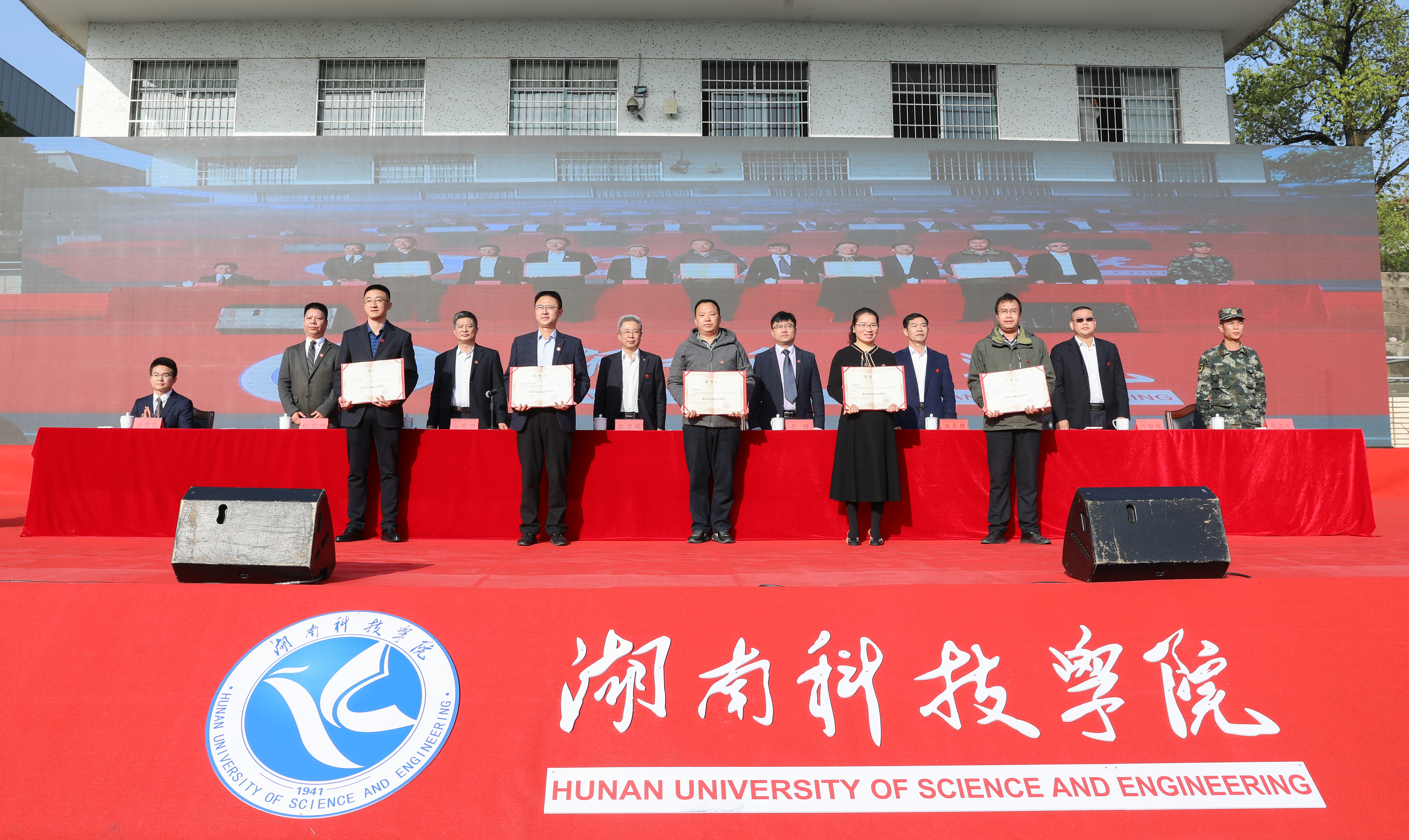 程智开宣读军训表彰文件,对音乐与舞蹈学院等5个军训工作先进单位、二营一连等25个优秀连队、曾健君等30名优秀教官以及桃园学生宿舍三栋A座613等53间优秀宿舍进行表彰。校领导为获奖单位和个人颁奖。