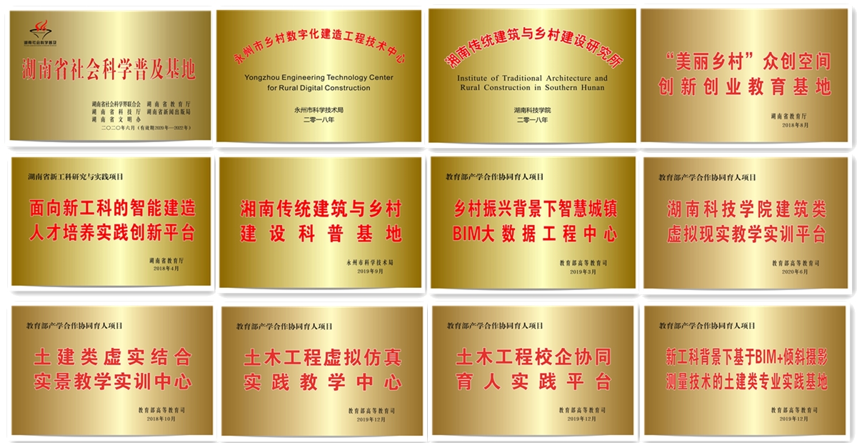 学院现有各类仪器设备价值一千余万元,包括探地雷达测试系统、飞马无人机、大疆无人机、法如三维激光扫描仪、GPS接收机、微机屏显式液压万能试验机等设备。拥有湖南省古建筑文化遗产保护传承社会科学普及基地、湖南省优秀校外实习基地、湖南省校企合作“美丽乡村”众创空间创新创业教育基地等多个省级实践教学基地,拥有BIM技术研发中心、万搏平台湘南传统建筑与乡村建设研究所、永州市“乡村数字化建造工程技术中心”、永州市“湘南传统建筑科普基地”以及教育部协同育人“乡村振兴背景下智慧城镇BIM大数据工程中心”等实践中心。学院注重与社会多方合作办学、协同育人,与中铁、中交以及湖南建工集团等企业签署了校企合作协议;先后与广州、深圳、长沙、杭州多家知名企业建立校外实习基地、创客中心等人才培养基地。