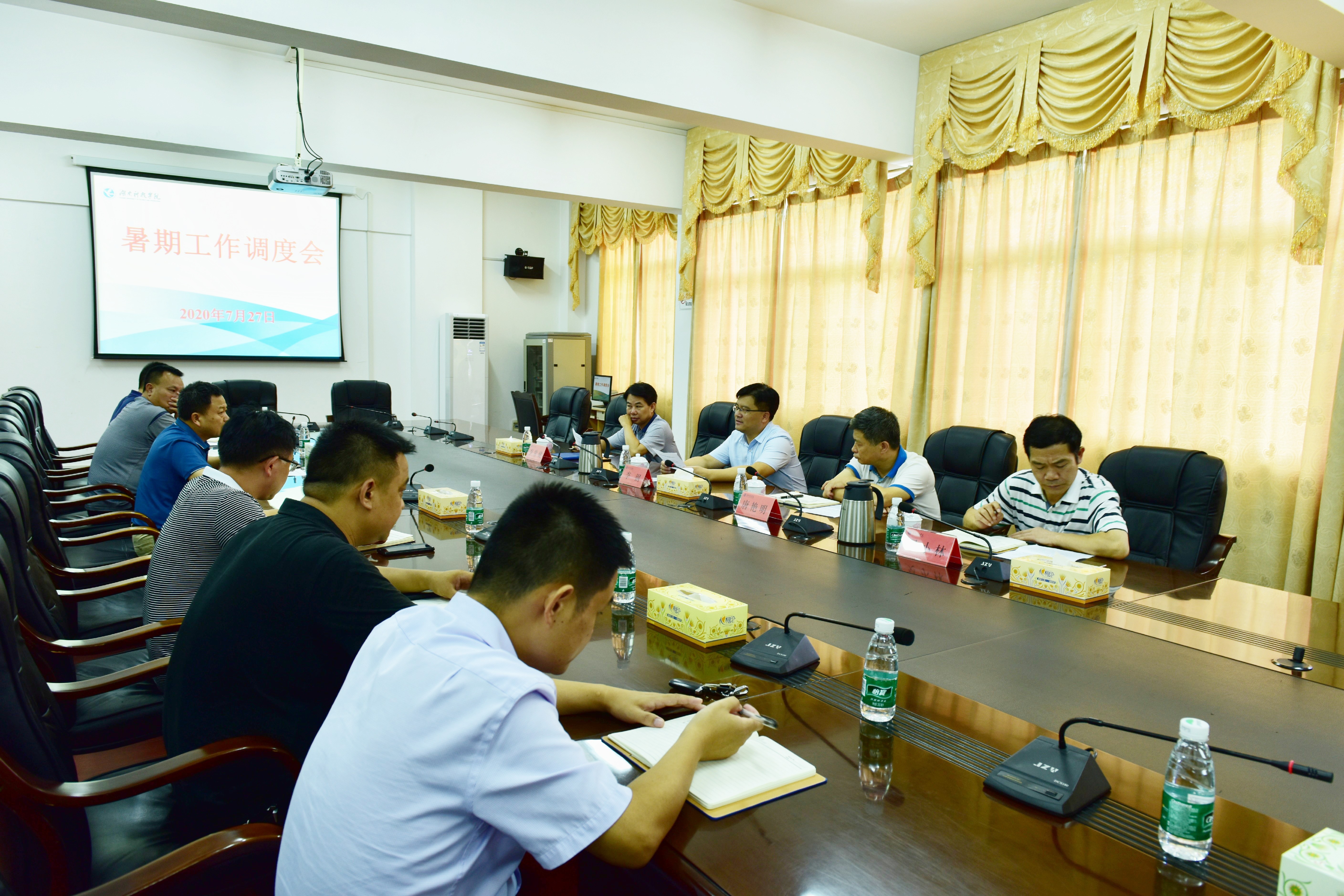 随后,学校暑期工作调度会在行政楼六楼会议室举行。党政办、教务处、采购中心、基建处、保卫处、后勤服务总公司等部门负责人分别就暑期相关工作进行了汇报。 校领导唐艳明、李常健、吴小林分别就安全保卫、招生宣传等相关工作提出了意见和建议。