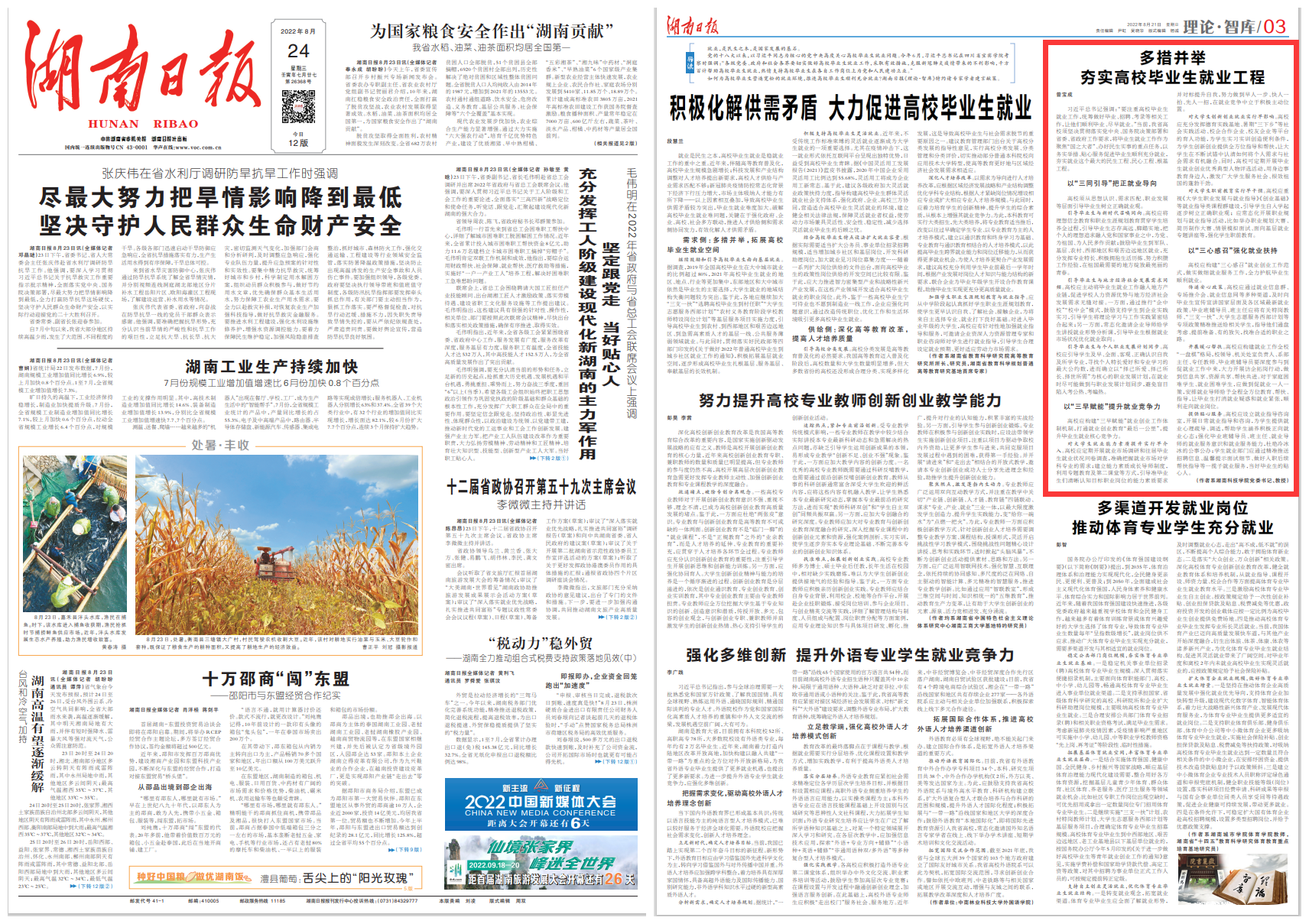 本网讯 8月21日,党委书记曾宝成在湖南日报理论版上发表题为《多措并举 夯实高校毕业生就业工程》的理论文章。