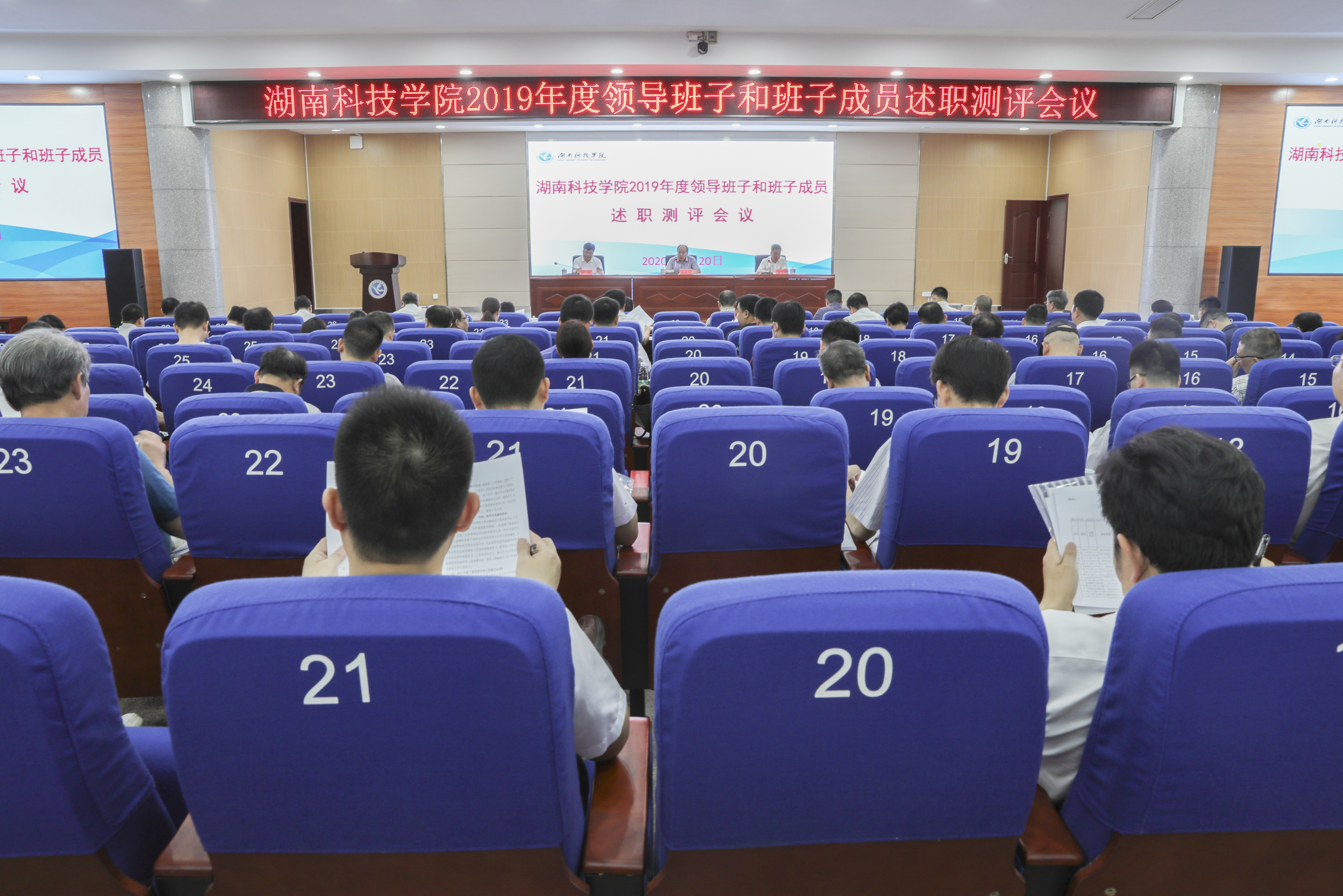 本网讯 5月20日上午,学校2019年度领导班子和班子成员述职测评会议在潇湘大讲堂举行。由省委教育工委组织部部长雷桂平,省委组织部干部三处四级调研员郭立业、省教育厅人事处四级调研员冯臻、省委党校组织人事部一级主任科员刘晓轩、省委组织部干部三处干部杨晓溪、省委组织部干部三处干部张译涵组成的考核组来校指导工作,学校党委委员、全体中层干部、近三年内退职的校级领导、民主党派负责人、“两代表一委员”、基层代表共161人参加会议。会议由校党委书记曾宝成主持。