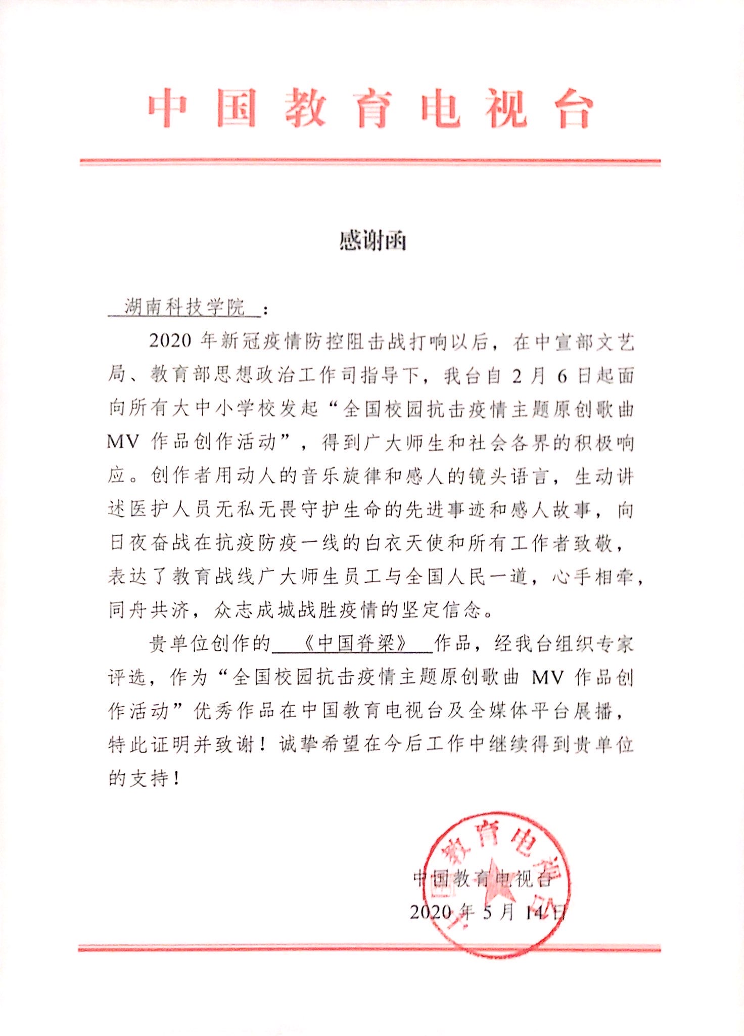本网讯 5月21日,学校收到中国教育电视台发来的感谢函,由我校教师潘清远作词、方新佩作曲的音乐作品《中国脊梁》受到致谢。函中称,在中宣部文艺局、教育部思政司指导的“全国校园抗击疫情主题原创歌曲MV作品创作活动”中,《中国脊梁》被评选为优秀作品,并在中国教育电视台及全媒体平台展播。
