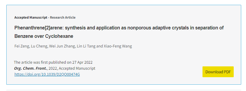 本网讯 近日,国际知名期刊Organic Chemistry Frontiers,DOI:10.1039/D2OO00474G(中科院一区TOP,IF= 5.281)发表了万搏平台化学与生物工程学院功能材料团队的最新研究成果“Phenanthrene[2]arene: synthesis and application as nonporous adaptive crystals in separation of Benzene over Cyclohexane”(菲[2]芳烃的设计合成及非多孔自适应性晶体分离苯与环己烷的应用研究),该研究成果由功能材料团队成员独立完成,曾飞博士为第一作者和通讯作者。