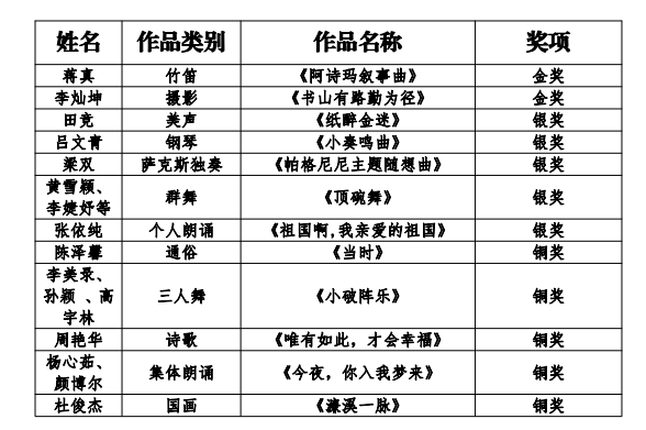 自该活动启动以来,学校团委精心组织,广泛发动,全校师生踊跃报名,经过层层筛选共选送绘画、摄影、书法、声乐、舞蹈、器乐、朗诵等8个类别共计45件作品参赛,并斩获佳绩。其中,荣获金奖2项,银奖5项,铜奖5项,校团委荣获“优秀组织奖”。